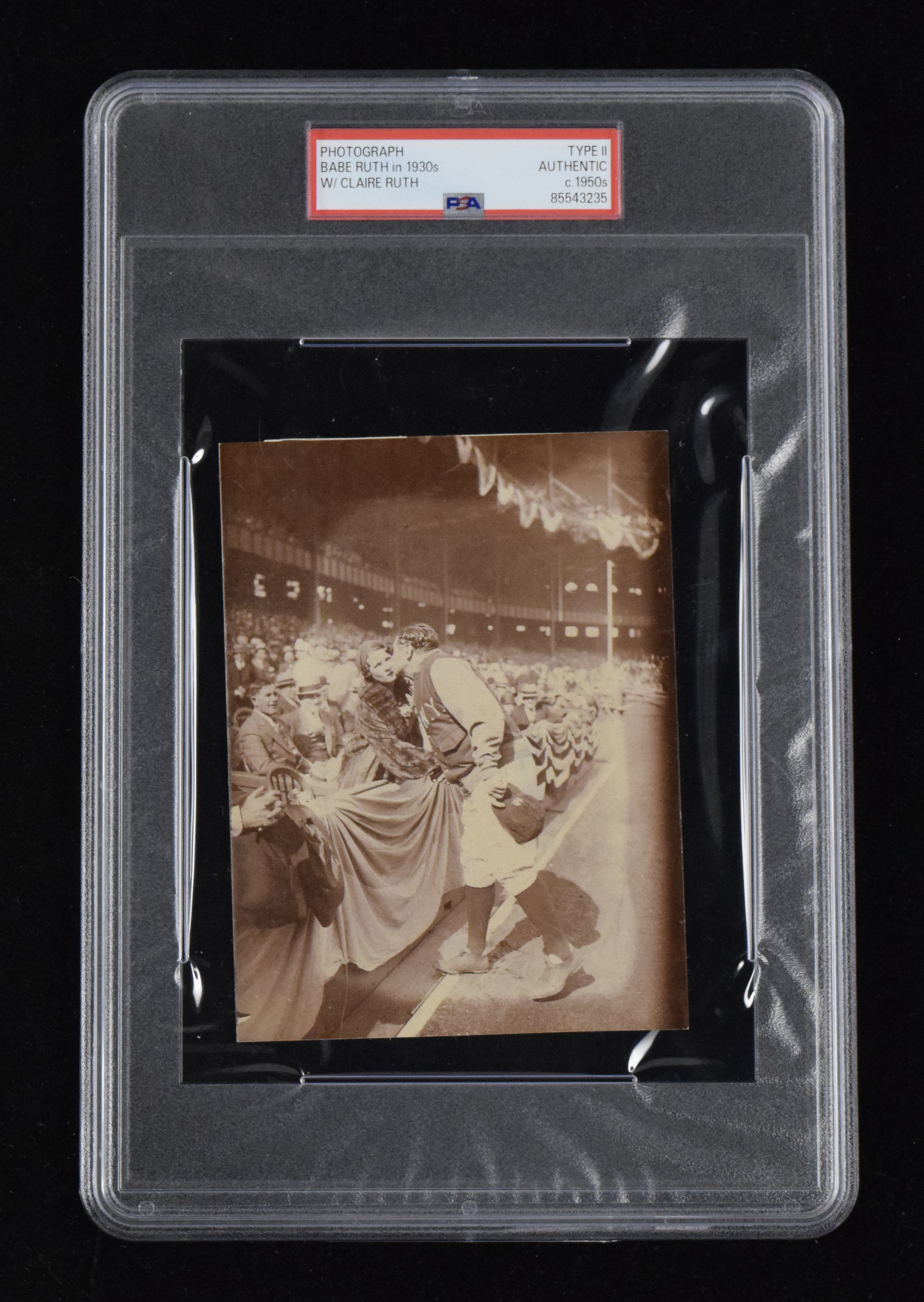 Description:Babe Ruth photograph c. 1950s (PSA/DNA Type II). Interesting 5"x3 3/4" photo pictures Ruth in the 1930s kissing his wife, Claire Ruth in the stands. Marked "Souvenirs and Sporting Goods" on the reverse along with an address obscured by scapbook damage/residue. Photo appears to have been trimmed down, and retains excellent original contrast and clarity. Authenticated and encapsulated by PSA/DNA (Type II): GD ($500-$750)