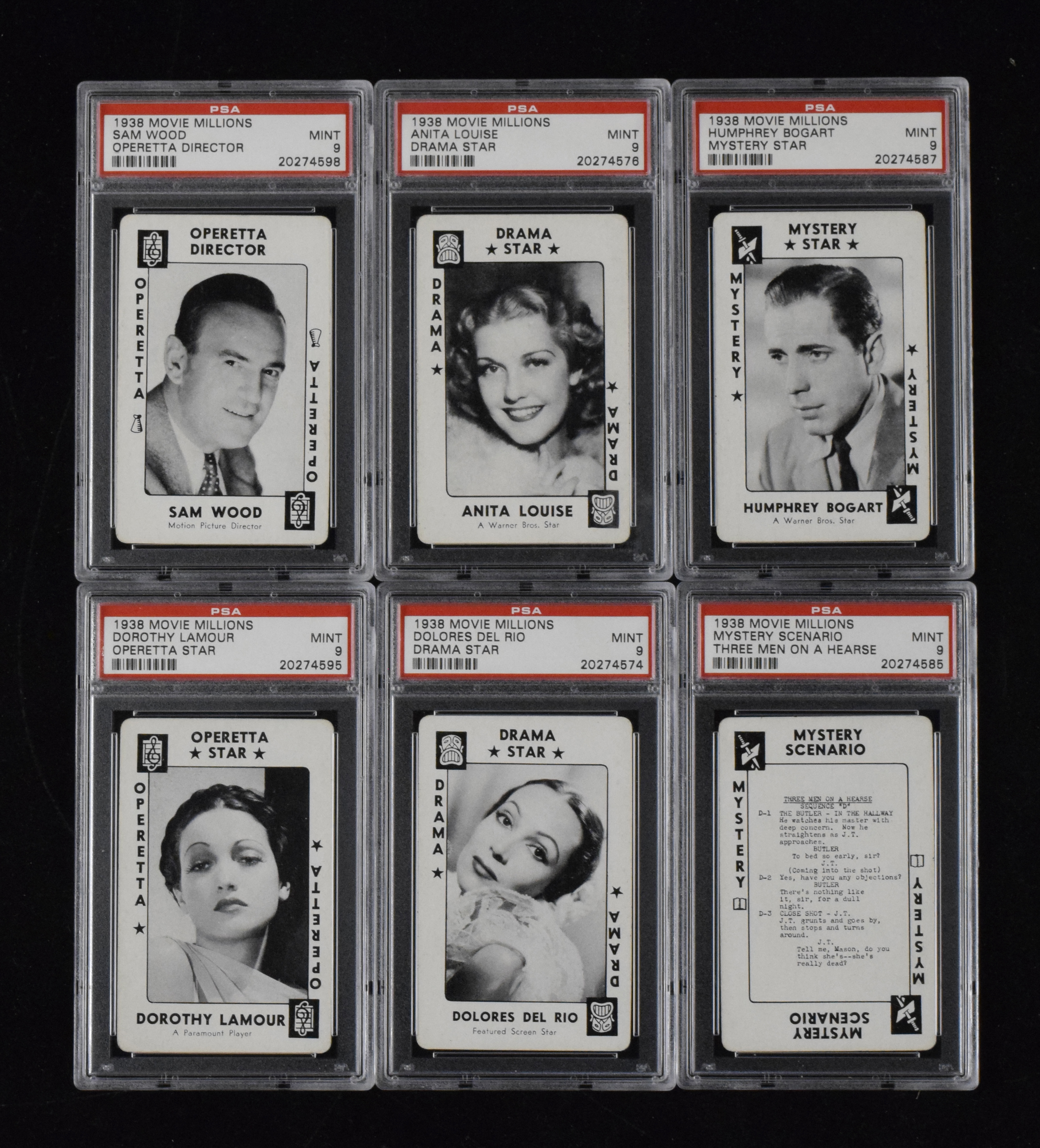 Description:High-grade 1938 Transogram Movie Millions complete PSA-graded set (53)(PSA 7 NM - PSA 9 MT). Obscure nonsport set from the Movie Millions board game set, issued in 1938. Set includes (53) different unnumbered cards, with the following grading composite: PSA 7 NM: (1) card; PSA 8 NM/MT: (40) cards and PSA 9 MT: (12) cards. Range: PSA 7 NM - PSA 9 MT. ($500-$750)