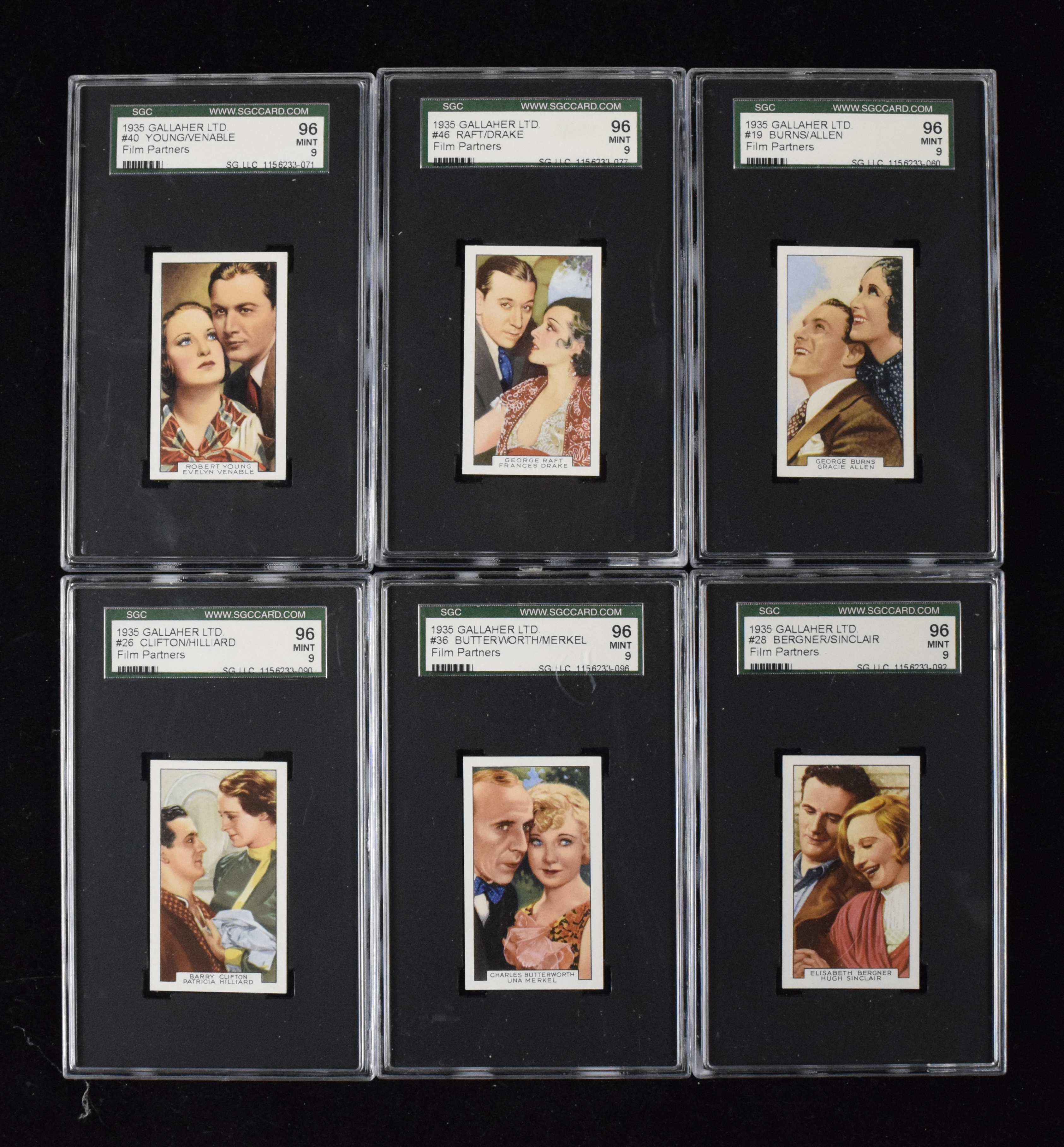 High-grade 1935 Gallaher Film Partners all SGC-graded complete set Complete Set (48) (SGC 5 EX - SGC 9 MT). Nonsports Gallaher Ltd. set depicts pairs of 1930s leading actors noted for their on-screen chemistry. All (48) cards in the set have been graded by SGC with the following composite: SGC 96 MINT 9: 10 cards, #'s 6 Bennett/Lederer, 13, 17 Gaynor/Baxter, 19 Burns/Allen, 20 Lee/Allen, 26, 28, 36, 40 Young/Venable, 46 Raft/Drake; SGC 92 NM/MT+ 8.5: 7 cards, #'s 15 Loy/Grant, 16 Talbot/Astor, 27 Muir/Cortez, 31 Bickford/Christians, 38 Rains/Wray, 41 Boland/Ruggles, 43 Stanwyck/William; SGC 88 NM/MT 8: 10 cards, #'s 7 Bushell/Gardner, 8, 10 Cooper/Crawford, 14, 18, 22, 24, 35, 39 Powell/Harlow, 42; SGC 86 NM+ 7.5: 4 cards, #'s 3, 4, 12, 32; SGC 84 NM 7: 12 cards, #'s 1, 2, 5, 9, 21, 25, 29, 33, 34, 37, 45, 48; SGC 80 EX/NM 6: 3 cards, #'s 30, 44, 47; SGC 70 EX+ 5.5: 1 card, #11; SGC 60 EX 5: 1 card, #23. Range: SGC 5 EX - SGC 9 MT. Note: Some of the SGC holders have scrapes, scuffs and wear ranging from light to moderate. ($500-$750)