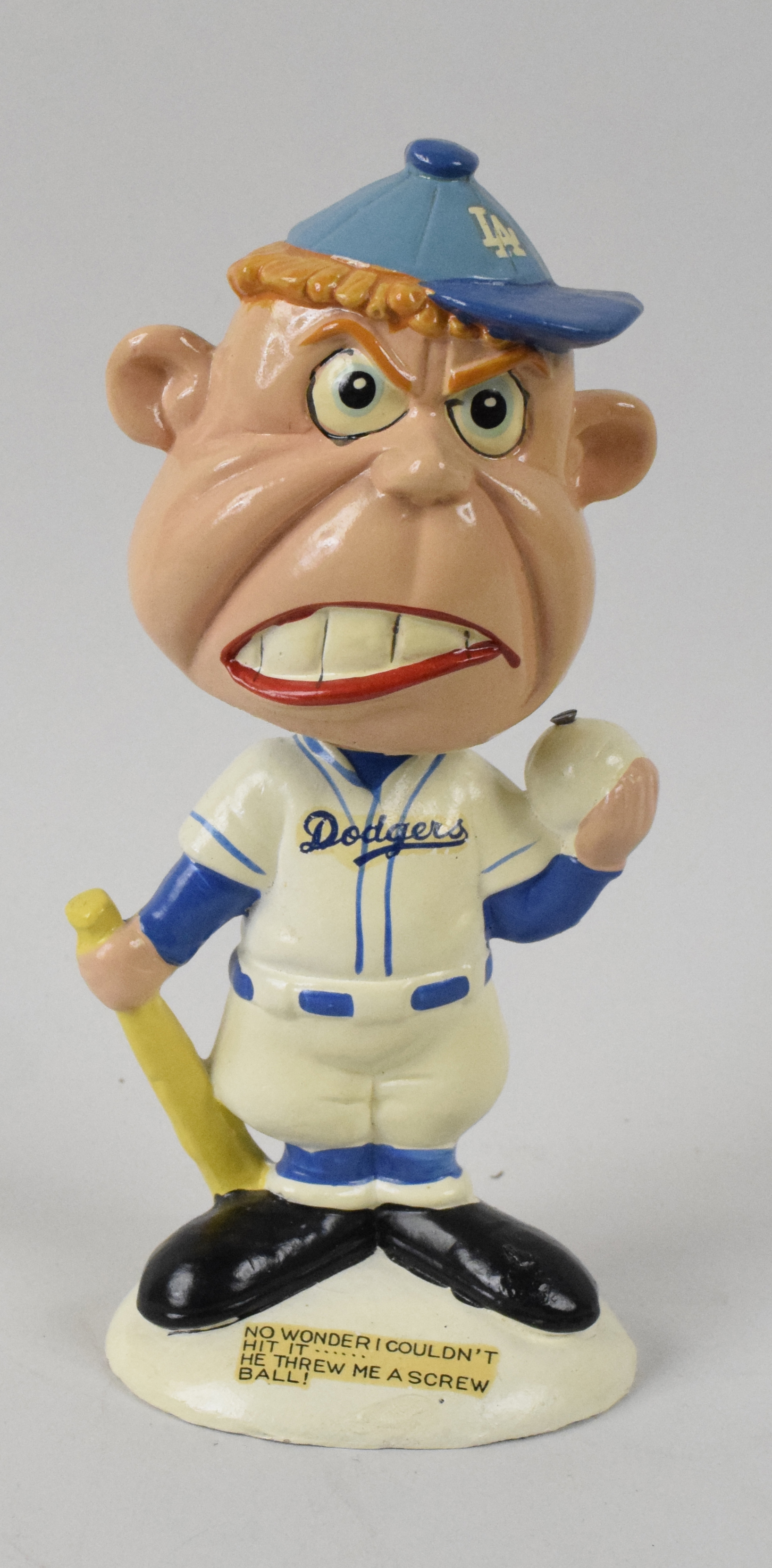 Description:High-grade Los Angeles Dodgers "weirdo" bobble head, c. 1960s (NM). Seldom-offered nodder displays nicely with bold original jersey logo and humurous inscription on the base: "No wonder I couldn't it it ... he threw me a screw ball!" Nodder, with "9 1/10" jersey number on the reverse, remains in high-grade condition with just the slightest hint of age toning. Original screw remains in the top of the baseball: NM. ($500-$1,000)