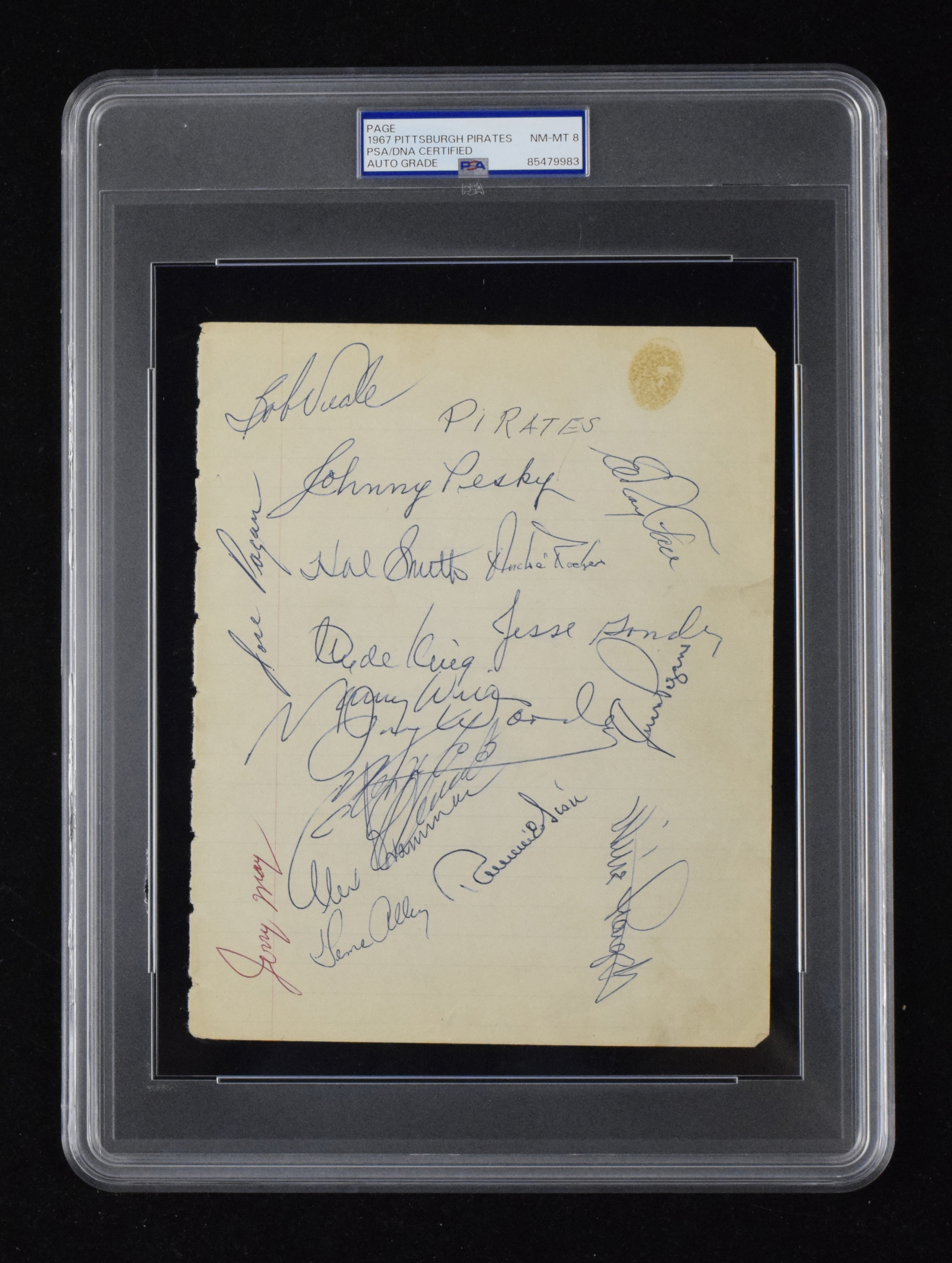 Description:1967 Pittsburgh Pirates notebook page autographed by (17), including Clemente and Stargell (PSA/DNA 8 NM/MT). Page with "Pirates" written at the top has been signed in ink by (17) members of the 1967 team, including Roberto Clemente, Willie Stargell, Maury Wills, Bob Veale, Elroy Face, Jose Pagan and others. Page has been encapuslated by PSA/DNA with an autograph grade of 8 NM/MT. Page has mild toning and a few small spots of staining: VG/EX. ($750-($1,250)