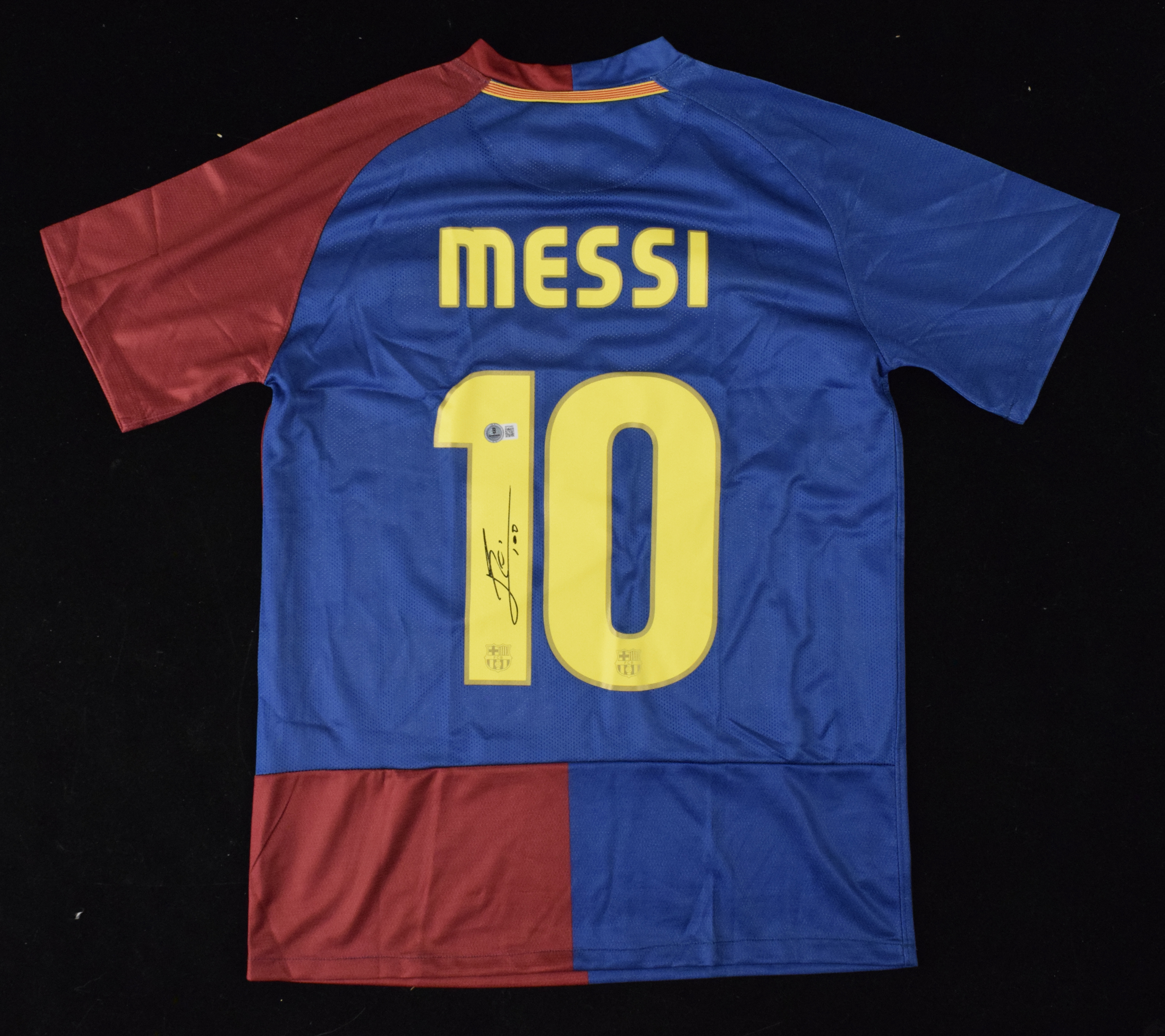 Description:Lionel Messi autographed Barcelona jersey with Beckett authentication (Sig. MT). Size M Nike FC Barcelona Final Roma 2009 jersey has been signed on the back number by superstar Lionel Messi, rating 9 out of 10. A Beckett authentication sticker also has been affixed to the back number. Jersey has little to no mentionable wear: NM/MT. ($500-$1,000)