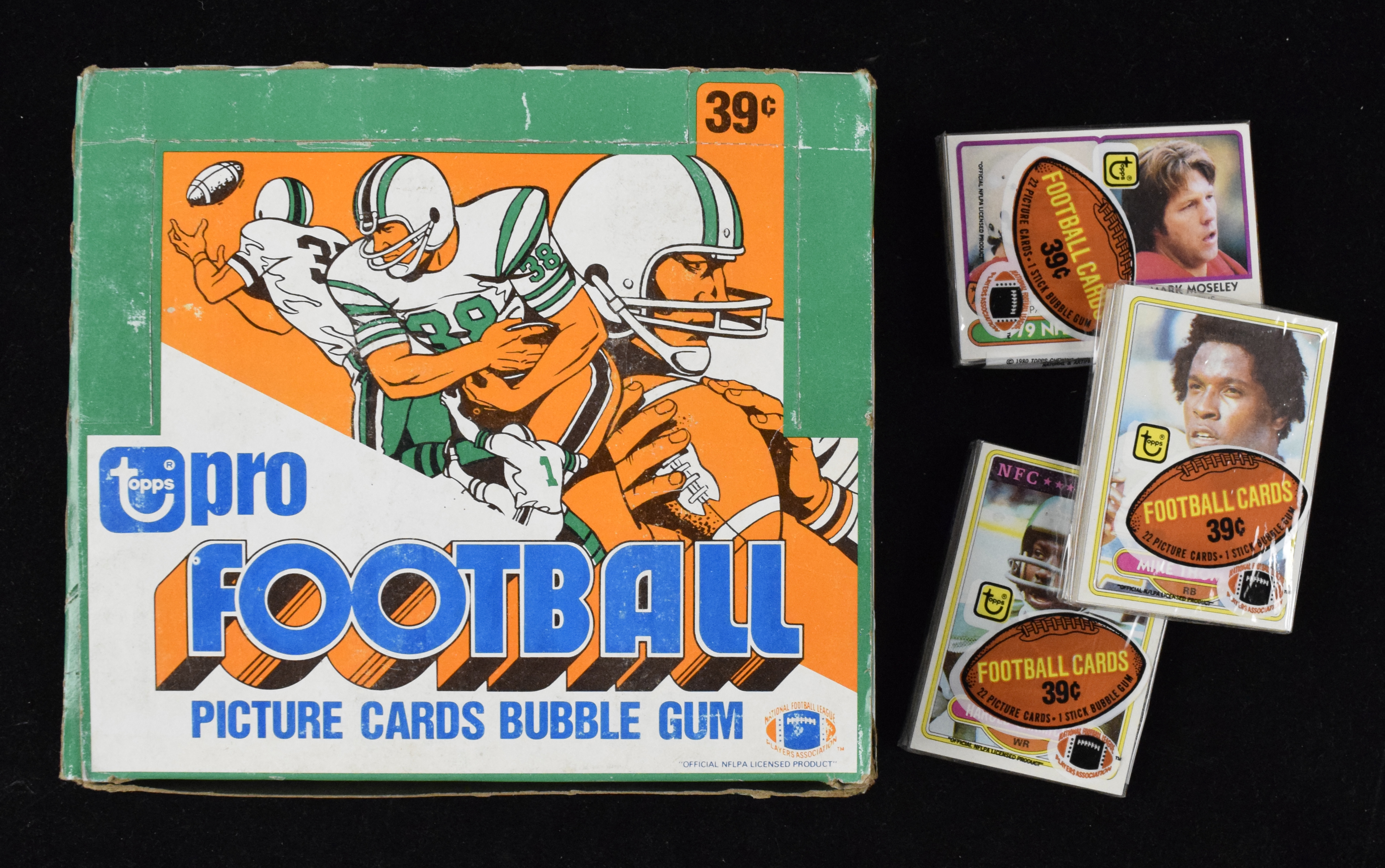 Description:1980 Topps football cello box (24 unopened packs) (Packs: NM-NM/MT). Original box includes (24) unopened cello packs, with (22) cards per pack, with mostly commons and minor stars showing. One pack has Harold Carmichael showing on top, and another has Drew Pearson showing on bottom. Possible rookie cards include Phil Simms, Ottis Anderson and others, plus numerous Hall of Famers. All packs remain tightly sealed, and box has moderate shelf wear. Packs: NM-NM/MT; Box: VG/EX. ($500-$1,000)