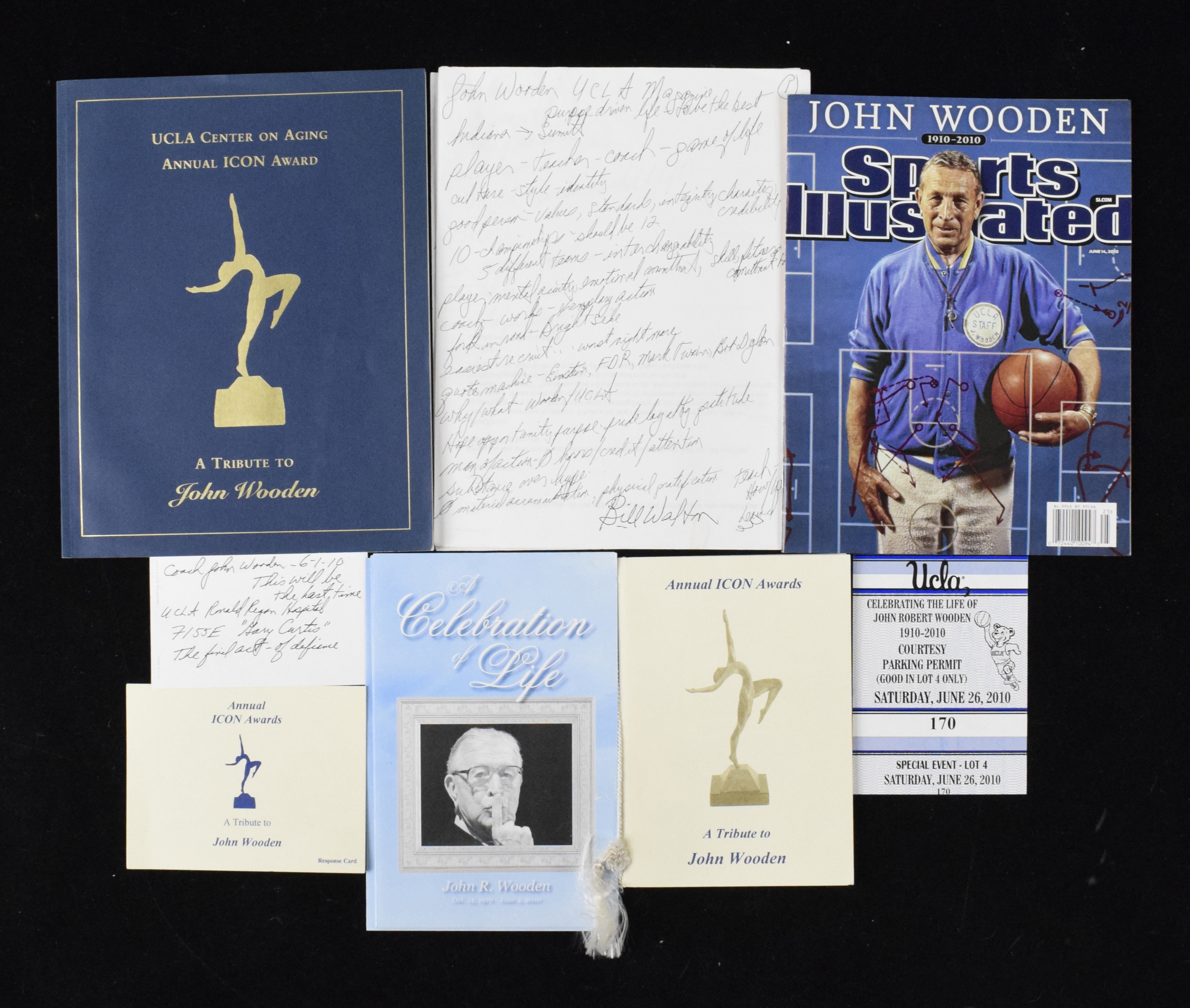 Description:John Wooden lot including Bill Walton's handwritten notes on Wooden (EX-NM/MT). Includes Walton's visitor's pass from his final visit with Coach Wooden on which he wrote "Coach John Wooden 6-1-10" "This will be the last time" "UCLA Ronald Reagan Hospital" "7155E Gary Curtis" "The final act of defiance" on the back (Coach Wooden checked into the hospital under the name Gary Curtis), 2-1/2 pages of Walton's notes on Coach Wooden, 5/17/1998 "Annual Icon Award: A Tribute To John Wooden" program with Walton's invitation to the event, 6/14/2010 Sports Illustrated with John Wooden cover, (4) bulletins from John Wooden's 6/26/2010 Celebration Of Life at Pauley Pavilion (with parking permit from the event). Includes certificate of provenance from Walton Family: EX-NM/MT 0