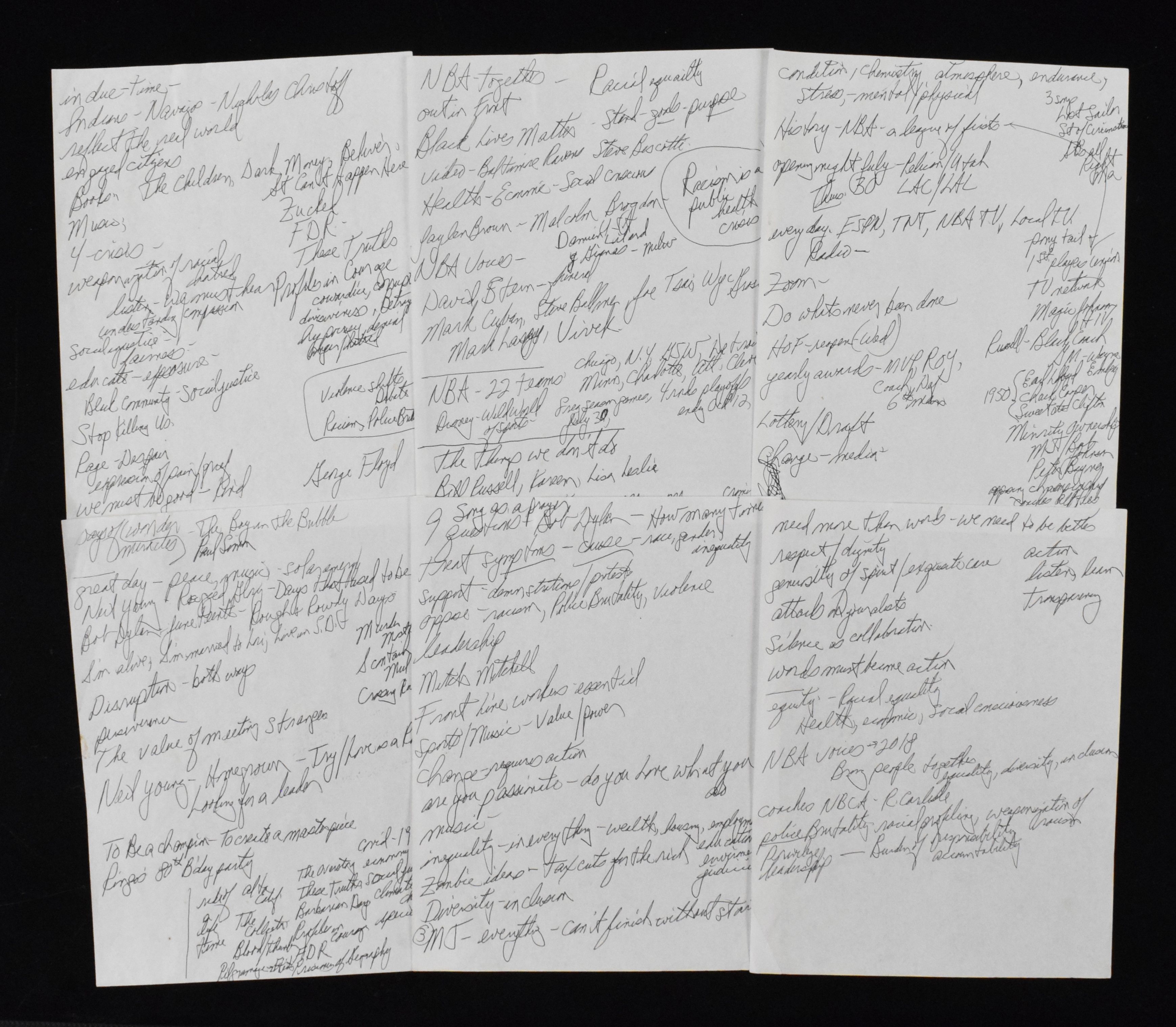 Description:Lot of Bill Walton's handwritten notes on the NBA and social justice (VG/EX-EX/MT). Includes (7) 8.5"x11" pages with Walton mentioning racial equality, police brutality, the NBA Together campaign, weaponization of racial hatred, the value of meeting strangers, and other social issues. A few pages have some minor stains. Includes certificate of provenance from Walton Family: VG/EX-EX/MT