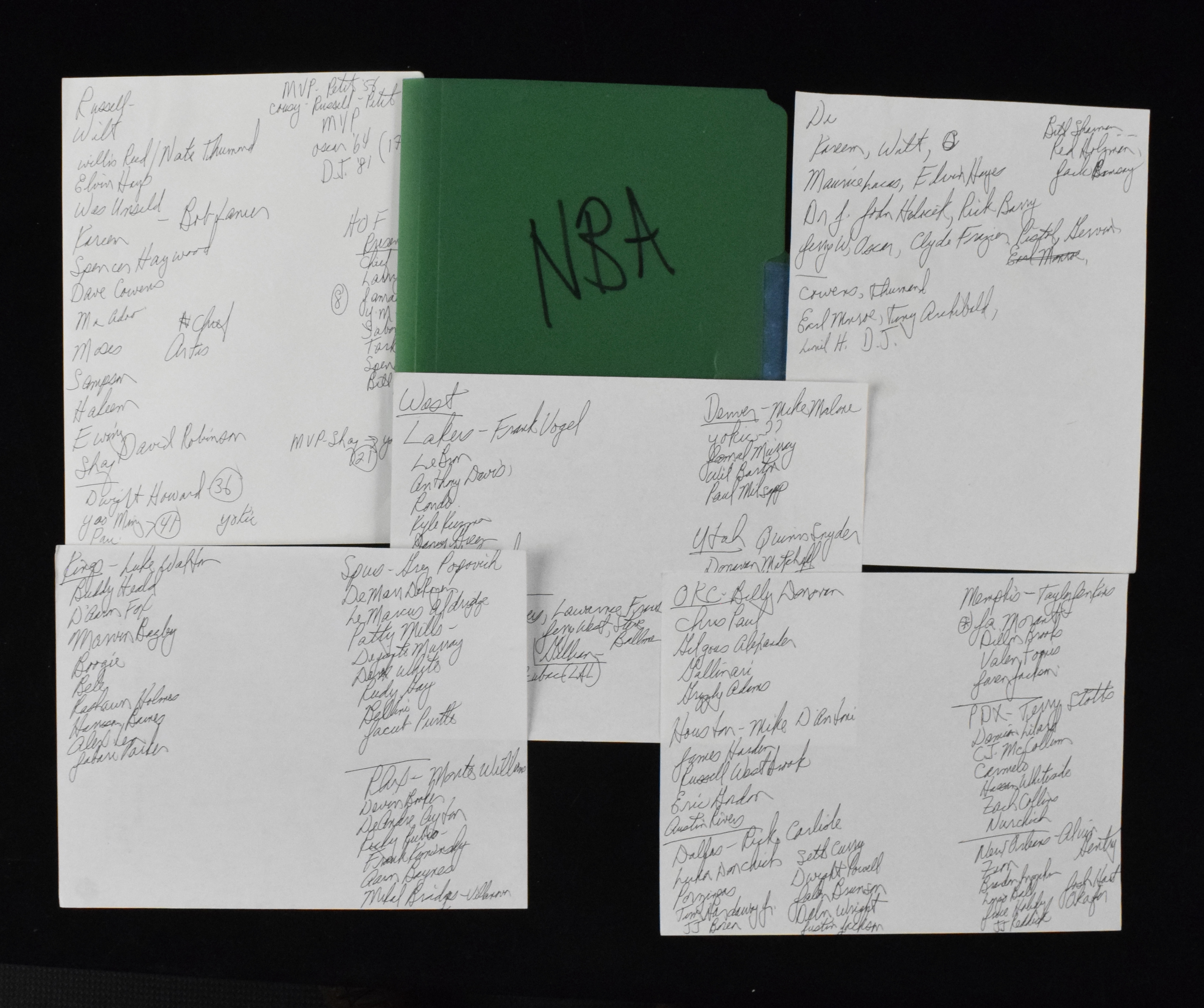 Description:Lot of Bill Walton's handwritten NBA notes (EX-EX/MT). Includes (8) 8.5"x11" pages with most notes being on the 2019-20 NBA teams and the NBA 75th Anniversary Team. Includes certificate of provenance from Walton Family: EX-EX/MT