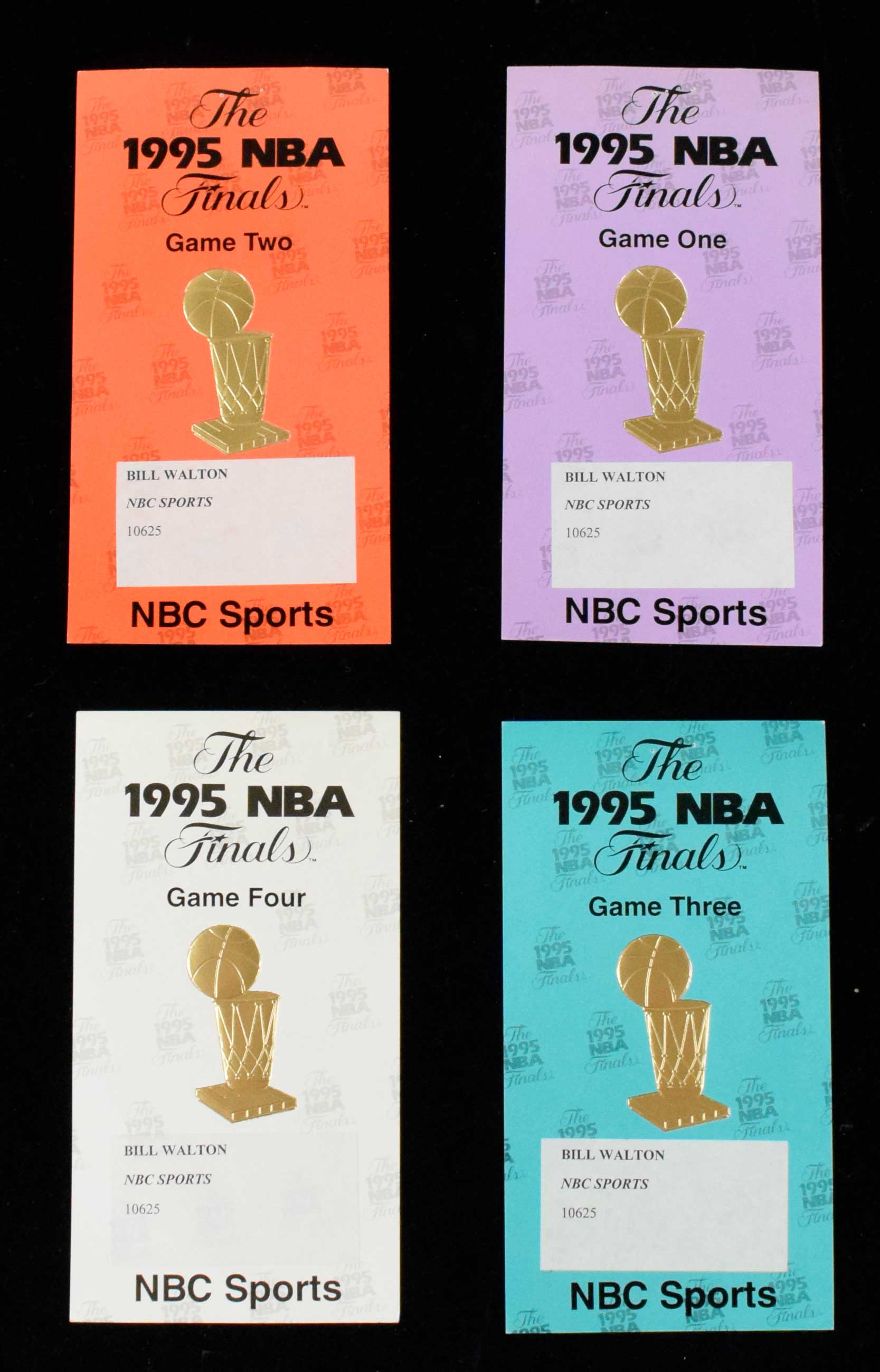 Description:Bill Walton's 1995 NBA Finals NBC Sports media passes - Rockets sweep series (GD-EX). Includes one for each game, with all having Walton's name and NBC Sports affiliation noted along the bottom. Games 1-3 have minor staple holes at the top (GD-VG). Game 4 grades EX. Includes certificate of provenance from Walton Family: GD-EX