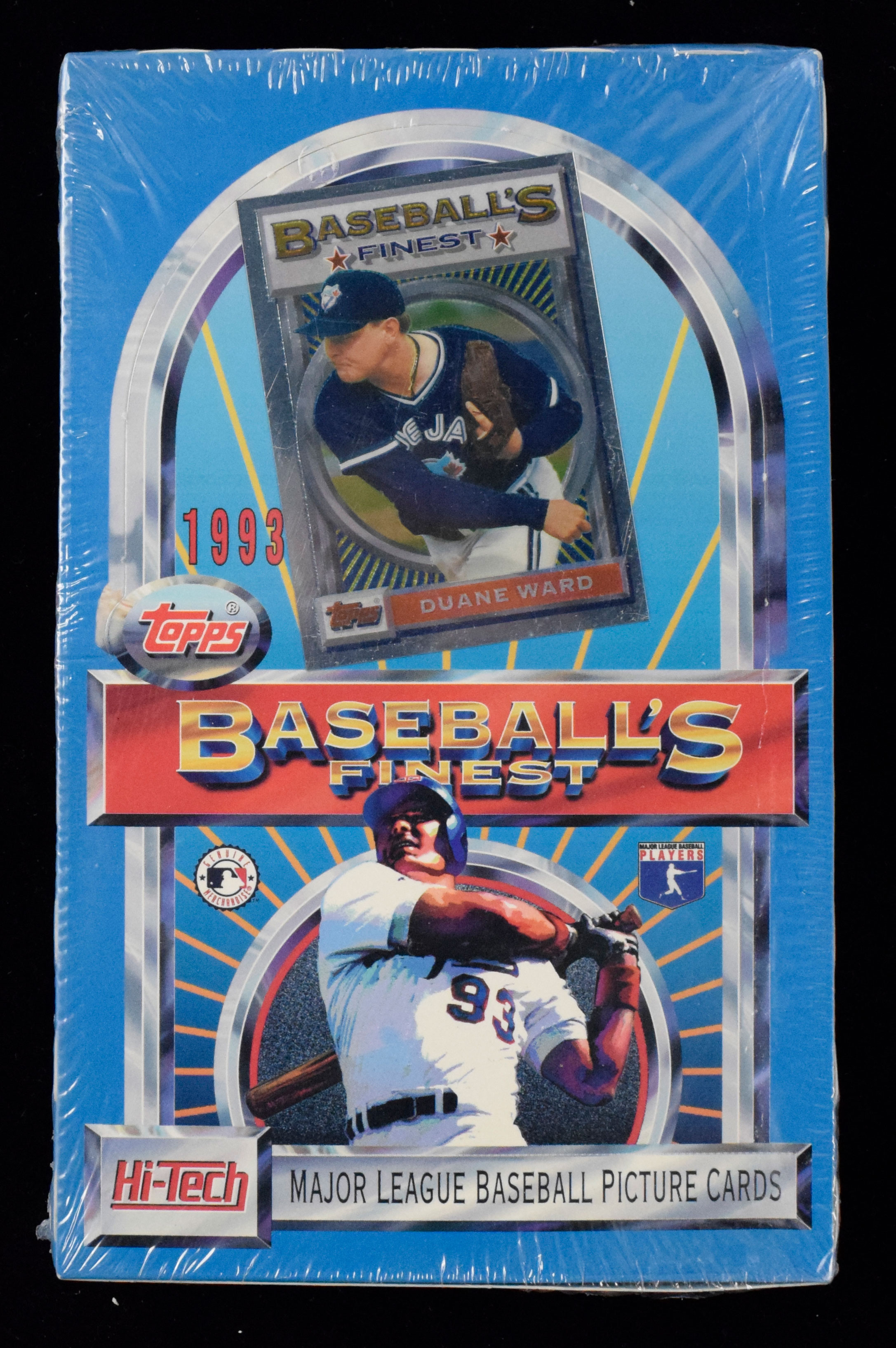 Description:1993 Topps Finest baseball unopened box (NM). Remains sealed, still containing (18) unopened packs of the premier Topps product from 1993, offering chances at Refractor insert cards. Minimal wear, so it is presumed that cards inside remain in high grade condition: NM ($750-$1,500)
