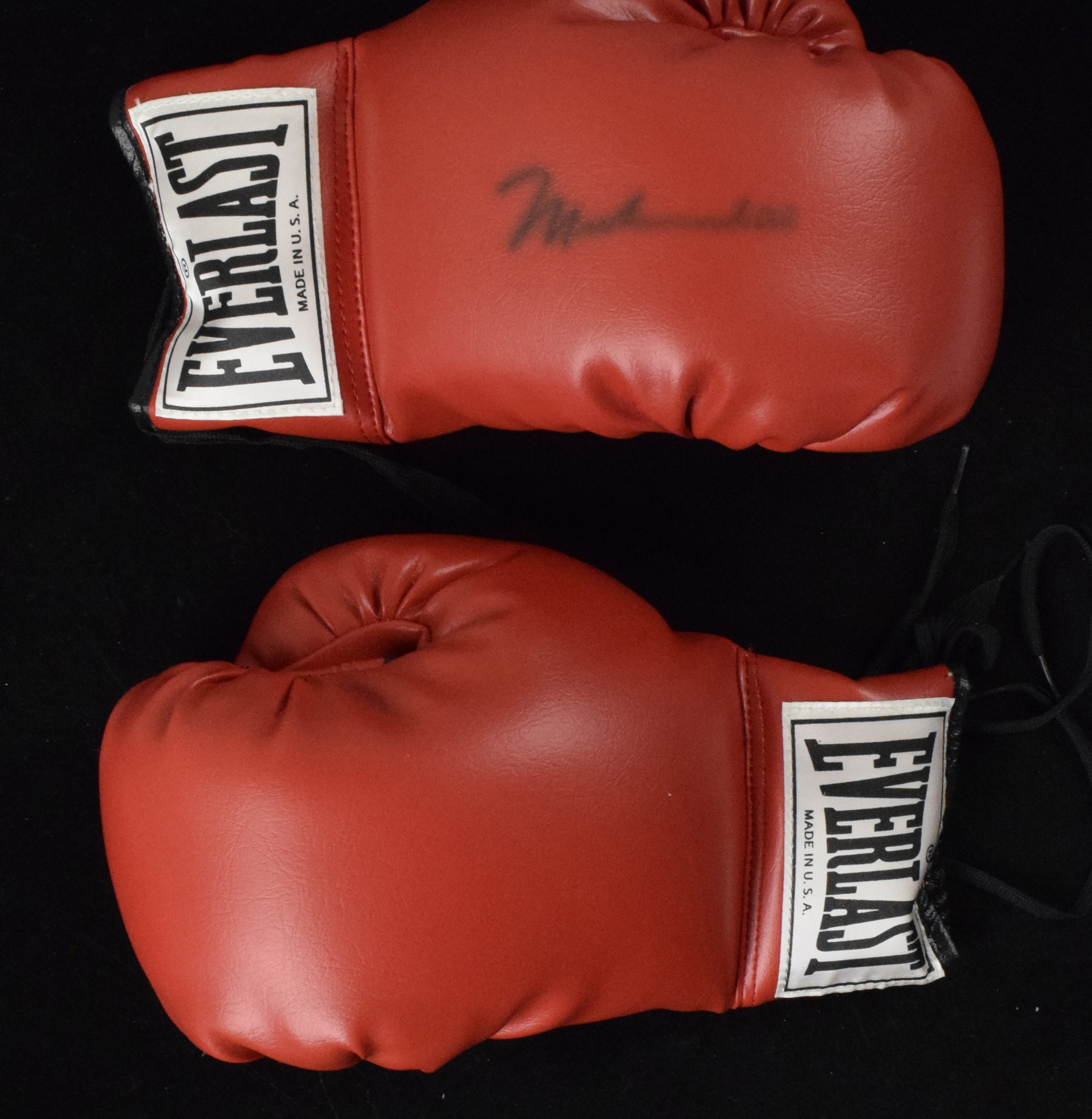 Description:Muhammad Ali autographed Everlast boxing glove - JSA (NM). Pair of gloves with the right signed by Ali in black marker. Signature rates 6/7 out of 10 due to some bleeding/fading. JSA serial #ed sticker is on the glove: NM ($300-$500)