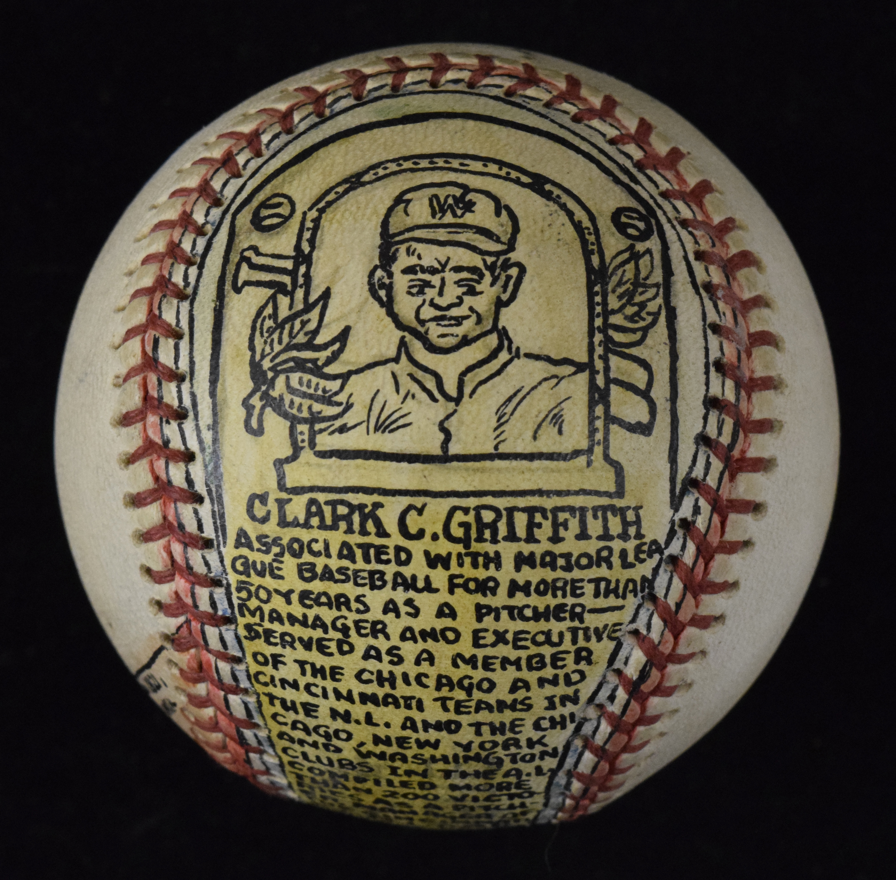 Description:Clark Griffith folk art painted baseball by George Sosnak (EX). Painstakingly hand painted by Sosnak with Griffith's career information and statistics, along with a Hall Of Fame plaque image. Minor stains on the unpainted surface: EX ($500-$750)