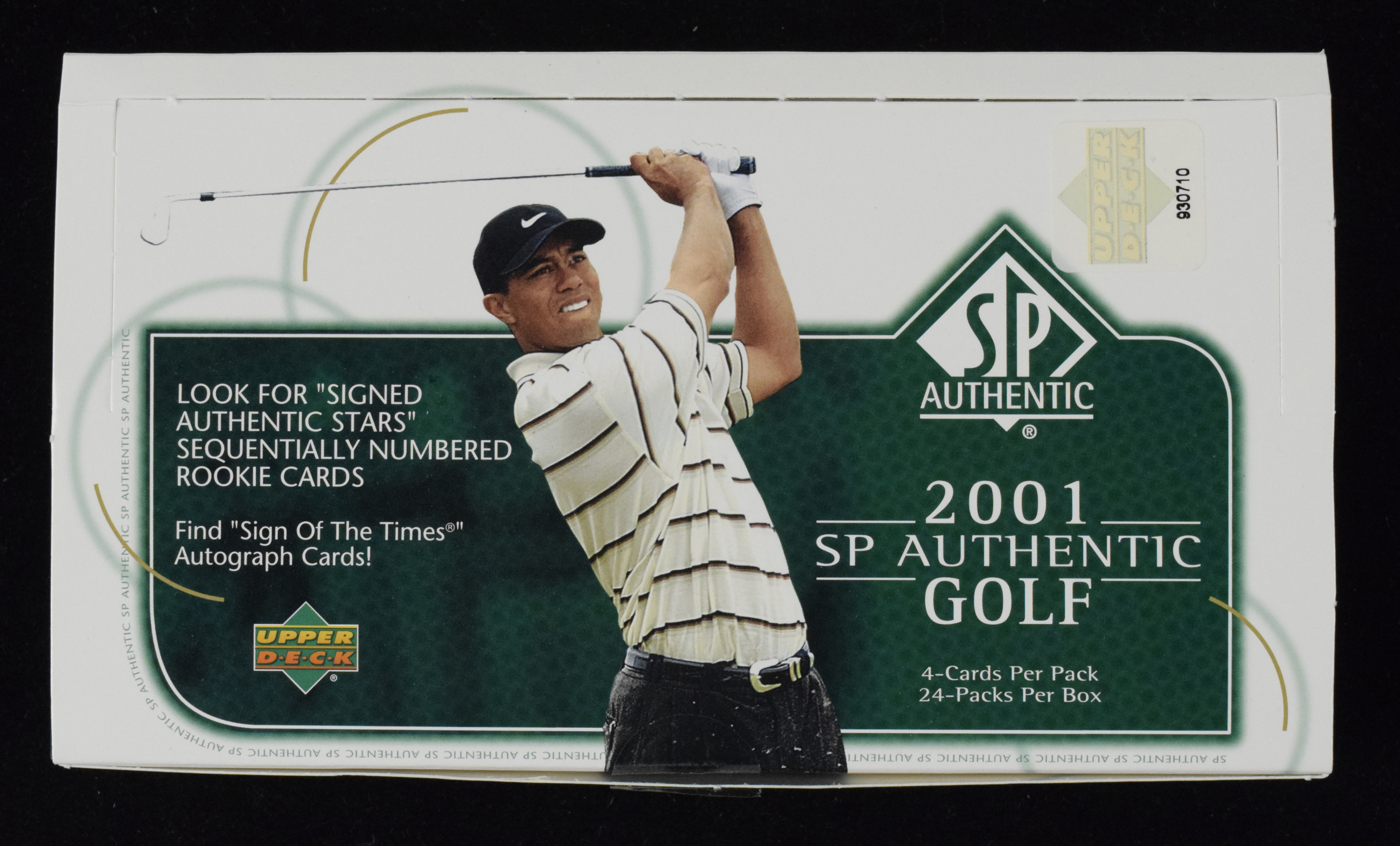 Description:2001 SP Authentic Golf open hobby box with (24) foil packs, Tiger Woods auto RC possible (Packs: NM/MT). Box is open on top, and inside are (24) unopened foil packs of (4) cards each. Desirable packs offer a chance at the key autographed rookie card of superstar Tiger Woods, numbered to 900. Packs: NM/MT. ($500-$1,000)