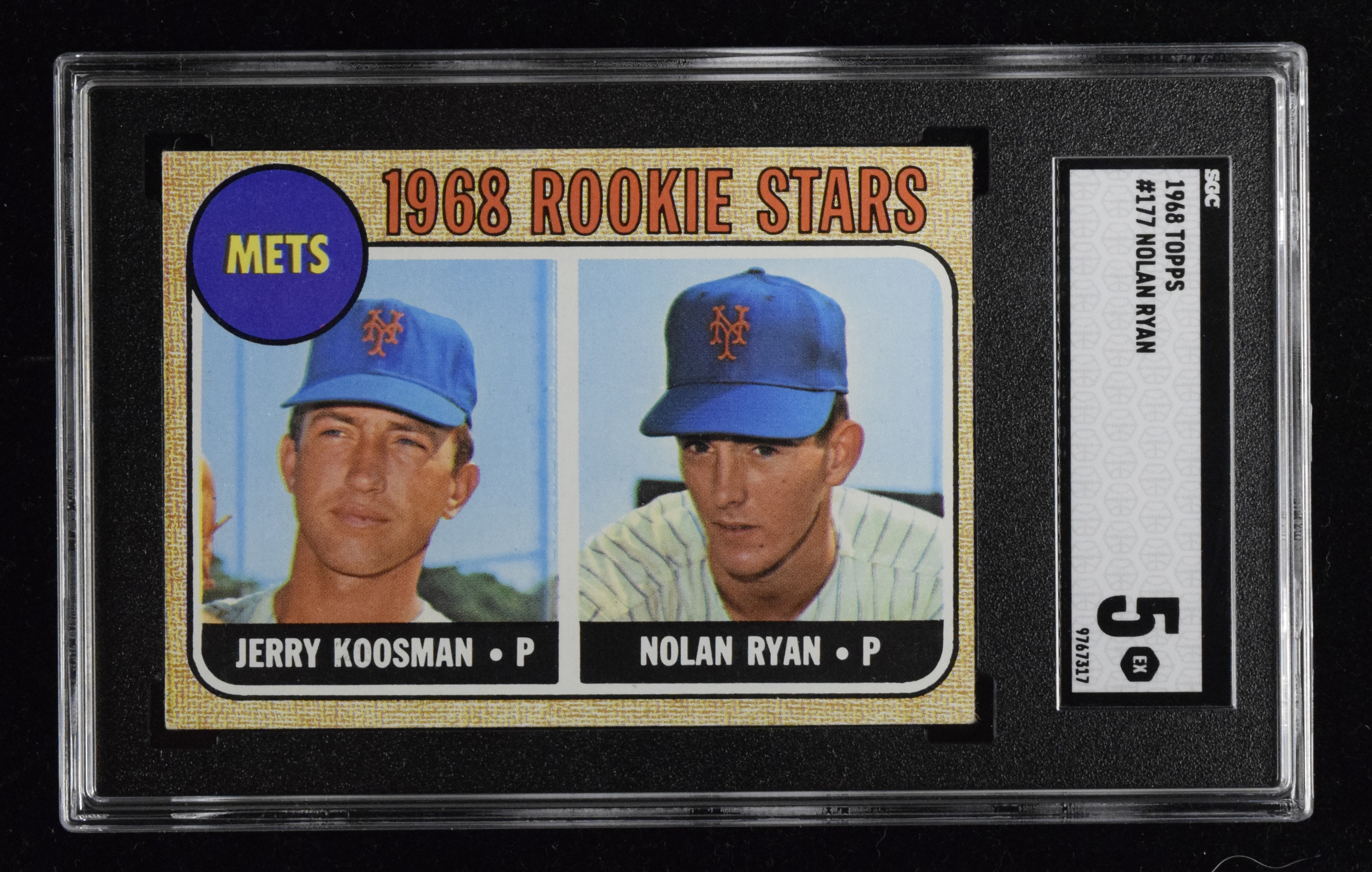 Description:1968 Topps #177 Nolan Ryan RC (SGC 5 EX). Nice, mid-grade key rookie card in the 1968 Topps set is centered approx. 65/35 with crisp registration and four touched corners. Back is well-centered and clean: SGC 5 EX. ($750-$1,250)