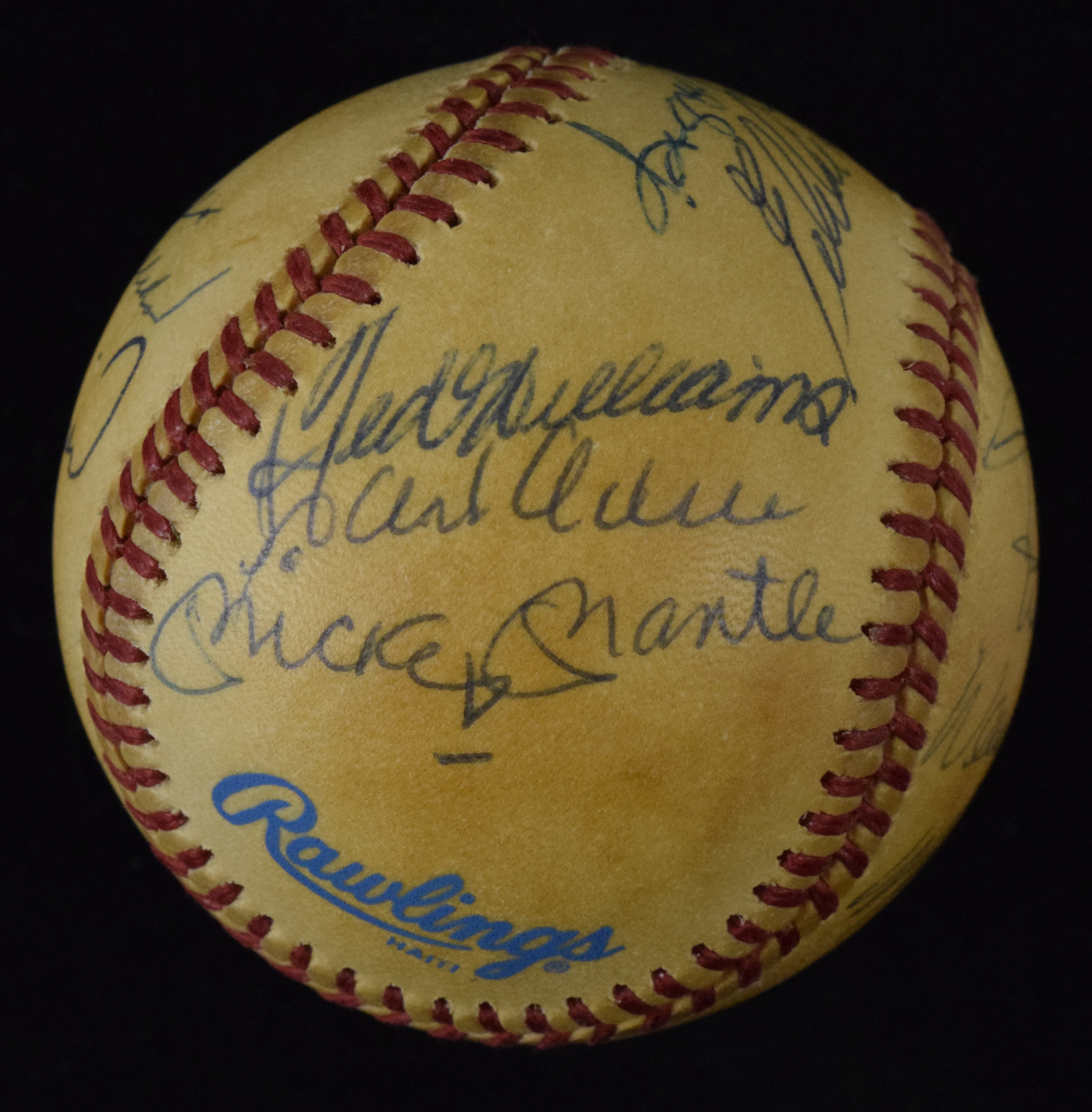 Description:500 Home Run Club autographed baseball with Mantle and Williams (Sigs. EX/MT-NM, Ball VG) Toned Rawlings B.Brown OAL baseball has been signed by Mickey Mantle, Ted Williams, Hank Aaron, Reggie Jackson (twice), Ernie Banks, Harmon Killbrew, Frank Robinson, Willie Mays, Willie McCovey, and Mike Schmidt. Ink signatures rate 8 to 8/9 out of 10: Sigs. EX/MT-NM, Ball VG ($750-$1,000)