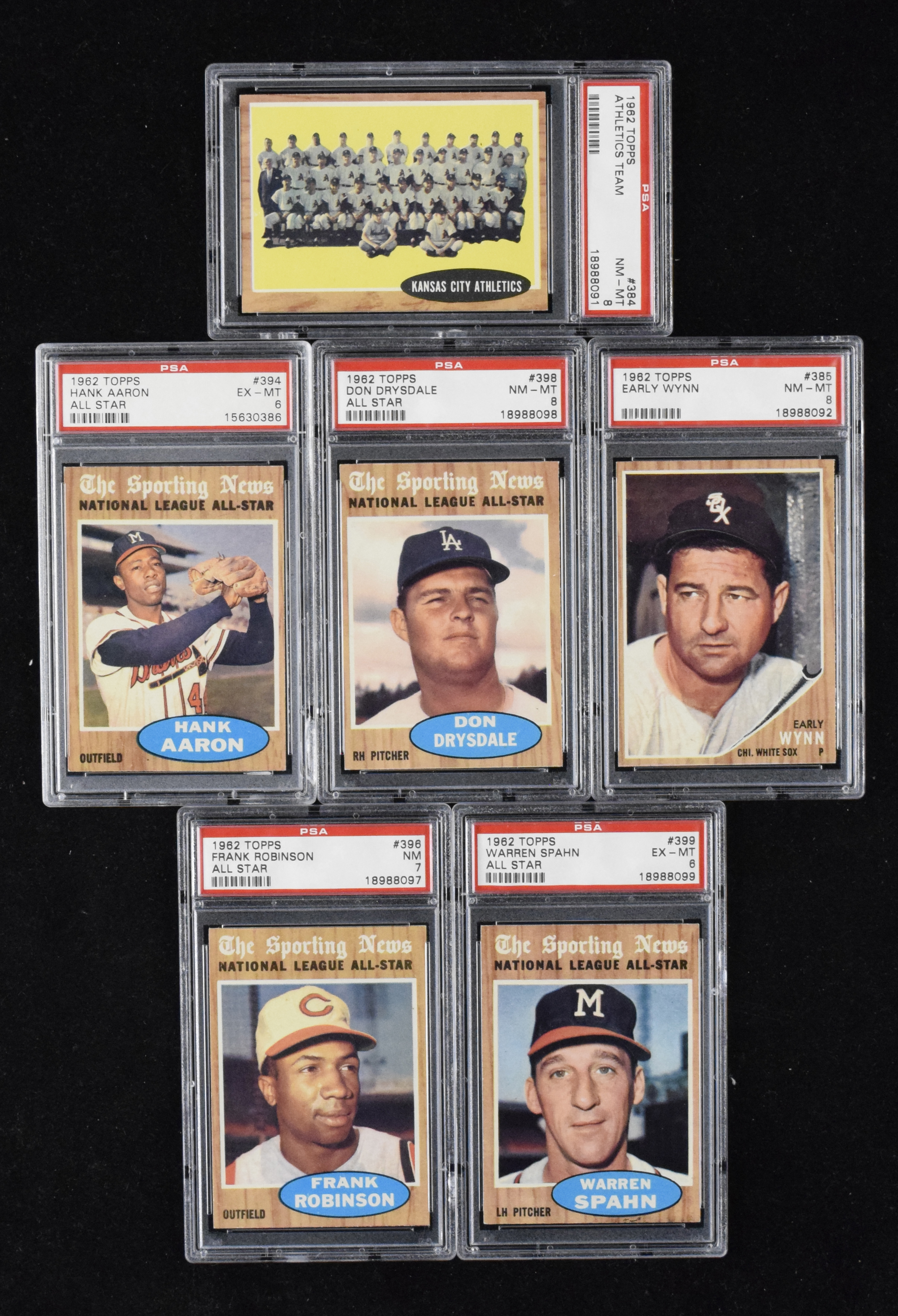 Description:Lot of (13) PSA-graded 1962 Topps cards, including Aaron, Robinson, Drysdale All-Stars (PSA 6 EX/MT-PSA 8 NM/MT). High-grade assortment of 1962 Topps cards incudes (8) PSA 8 NM/MT: #s 393 Roy McMillan AS, 396 Don Mincher, 385 Early Wynn, 384 Athletics team, 380 Lew Burdette, 378 Bennie Daniels, 377 Johnny Orsino and 398 Don Drysdale AS; (1) PSA 7 NM: 396 Frank Robinson AS; (1) PSA 7 NM (ST): 382 Dick Williams and (3) PSA 6 EX/MT: #s 399 Warren Spahn AS, 394 Hank Aaron AS and 389 Smoky Burgess ($400-$600)