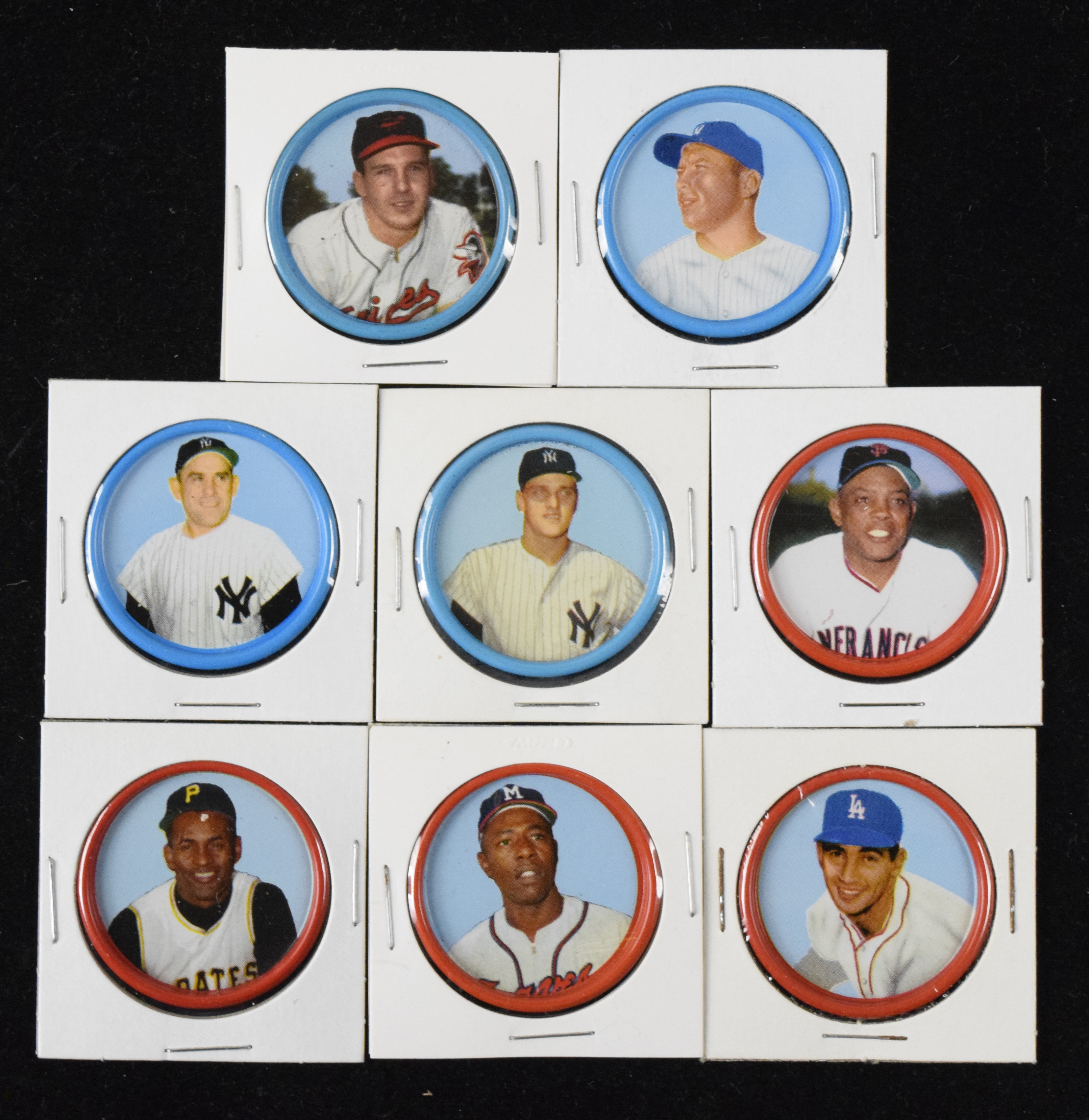 Description:High-grade 1963 Salada-Junket Baseball Coins complete set (63) with Mantle and Mays (EX/MT-NM overall). Very sharp complete set of (63) metal coins in average EX/MT-NM condition with only a small portion lesser and some in higher grades mixed in. Includes a good number of Hall of Famer and star players, such as Sandy Koufax, Don Drysdale, Bob Gibson, Warren Spahn, Juan Marichal, Bill Mazeroski, Orlando Cepeda, Ernie Banks, Willie Mays, Roberto Clemente, Hank Aaron, Eddie Mathews, Billy Williams, Frank Robinson, Mickey Mantle, Brooks Robinson, Roger Maris, Yogi Berra, and Al Kaline: Avg. EX/MT-NM with full range EX-MT, with each individually housed in cardboard coin holders. $500-$1,000)