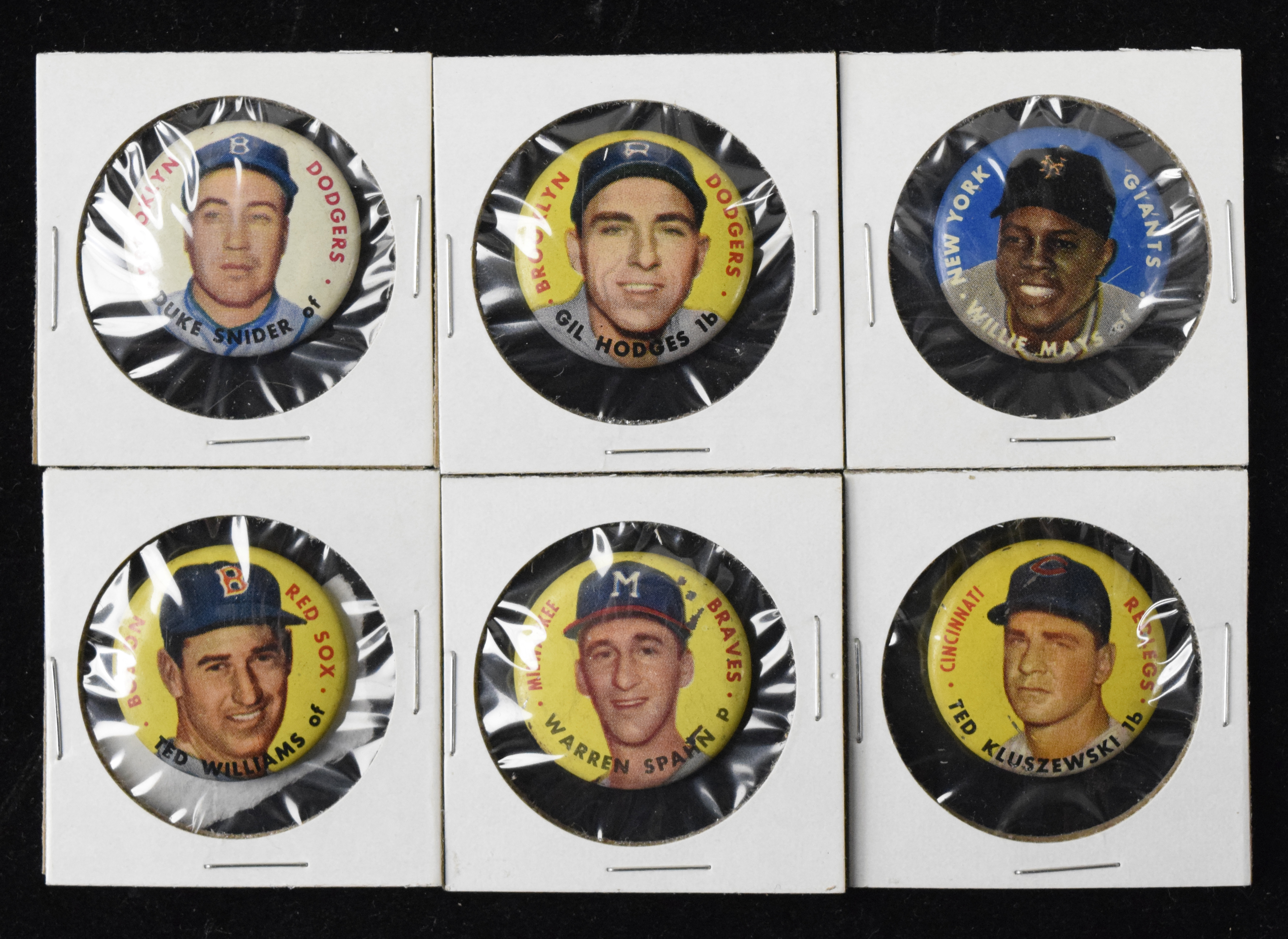 Description:Scarce 1956 Topps Pins lot of (28) with Mays, Williams and Snider (GD-EX/MT). Tough-to-assemble quantity of 1956 Topps Pins (with duplication), notable for being one of the first of many Topps oddball issues to come. Colorful pins measuring 1 1/8" in diameter have the same player images Topps used for its 1956 card set. Includes (24) diff.: Ted Williams, Willie Mays, Ken Boyer, Duke Snider, Al Rose, Ted Kluszewski, Gil Hodges, Warren Spahn, Hank Sauer, Ray Boone, Carlos Paula, Vic Power, (2) Jim Rivera, Frank Sullivan, (4) Dale Long, Bob Kennedy, Jack Harshman, Joe Collins, Karl Spooner, Johnny O'Brien, Wally Moon, Al Smith, Harvey Haddix and Herman Wehmeier. Most appear VG/EX. Range: GD-EX/MT, with each individually housed in cardboard coin holders. ($500-$1,000)