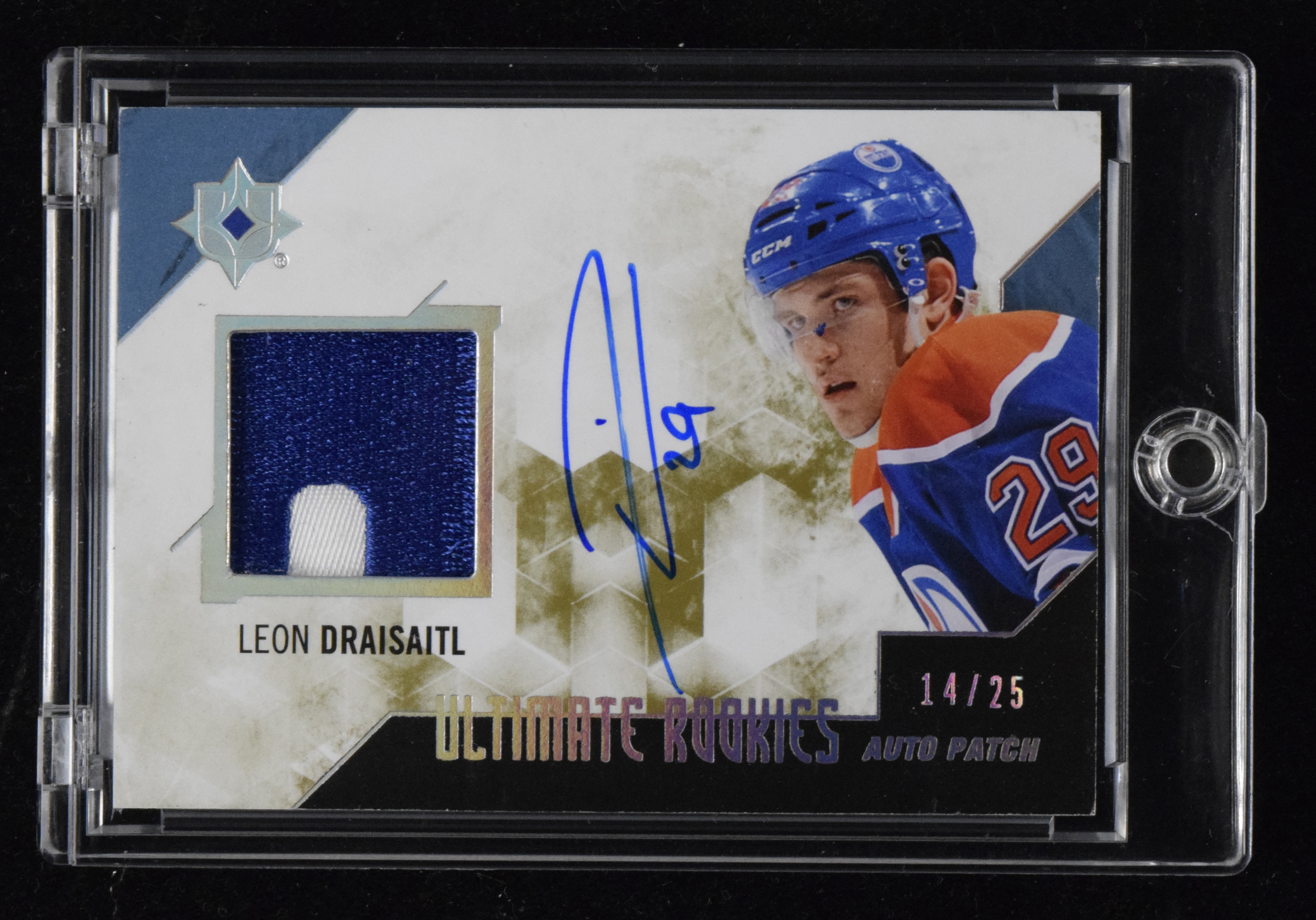 Description:Leon Draisaitl signed 2014-15 Upper Deck Ultimate rookie patch autograph insert card #ed 14/25 (NM). 2014-15 Upper Deck Ultimate Collection "Ultimate Rookies Silver Spectrum Autographed Patch" #122 signed by Draisaitl in blue marker. Signature rates 8/9 out of 10. The card is numbered 14/25: NM ($400-$600)