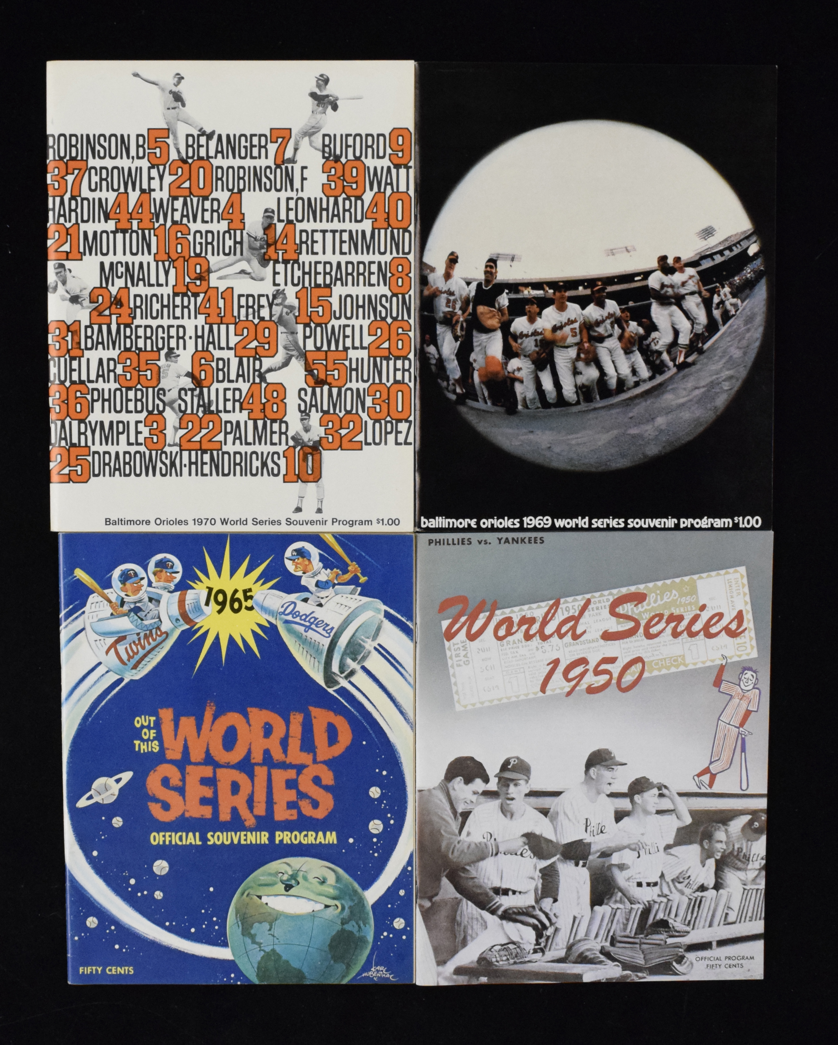 Description:Lot of (3) 1965-1970 World Series programs, plus (1) 1950 reprint (EX-NM). Lot includes (1) 1965 World Series program (unscored; EX/MT); (1) 1969 World Series program (unscored; EX/MT) and (1) 1970 World Series program (unscored: EX). Also includes (1) c. 1980 reprint publication of the 1950 World Series program (NM). Range: EX-NM.
