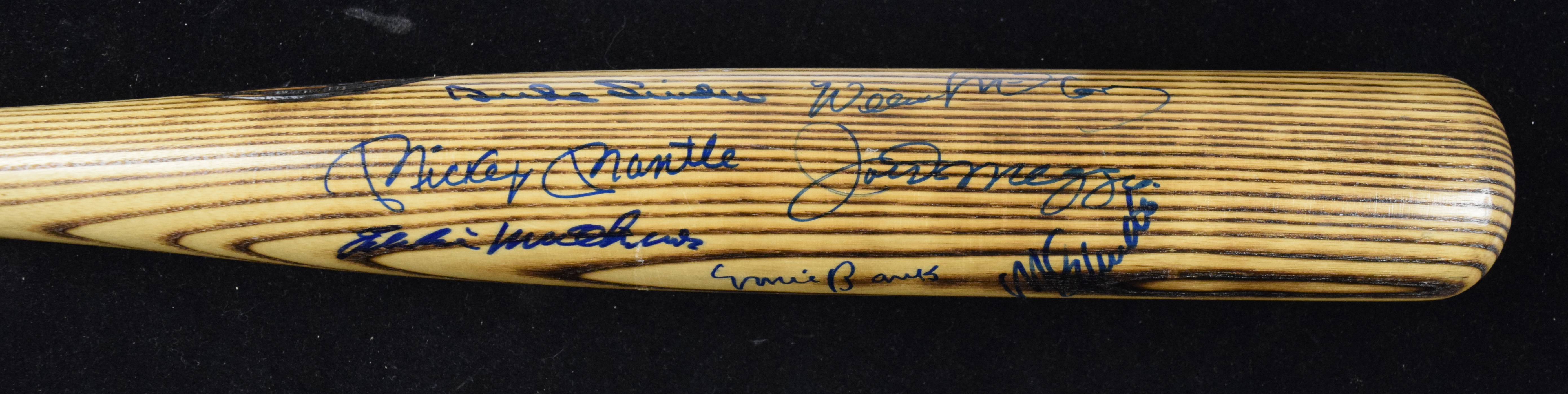 Description:Hall Of Famers multi-signed baseball bat loaded with better names (EX/MT-NM). 35" Louisville Slugger R161 Frank Robinson post career pro stock bat signed by (14) including Robinson with "586" inscription, Stan Musial, Mickey Mantle, Joe DiMaggio, Willie Mays, Hank Aaron, Al Kaline, Harmon Killebrew, Eddie Mathews, Ernie Banks, Willie McCovey, Duke Snider, Mike Schmidt, and Reggie Jackson. Signatures rate 7/8 to 10 (avg 8/9) out of 10. A few small spots of very minor surface wear: EX/MT-NM ($750-$1,500)
