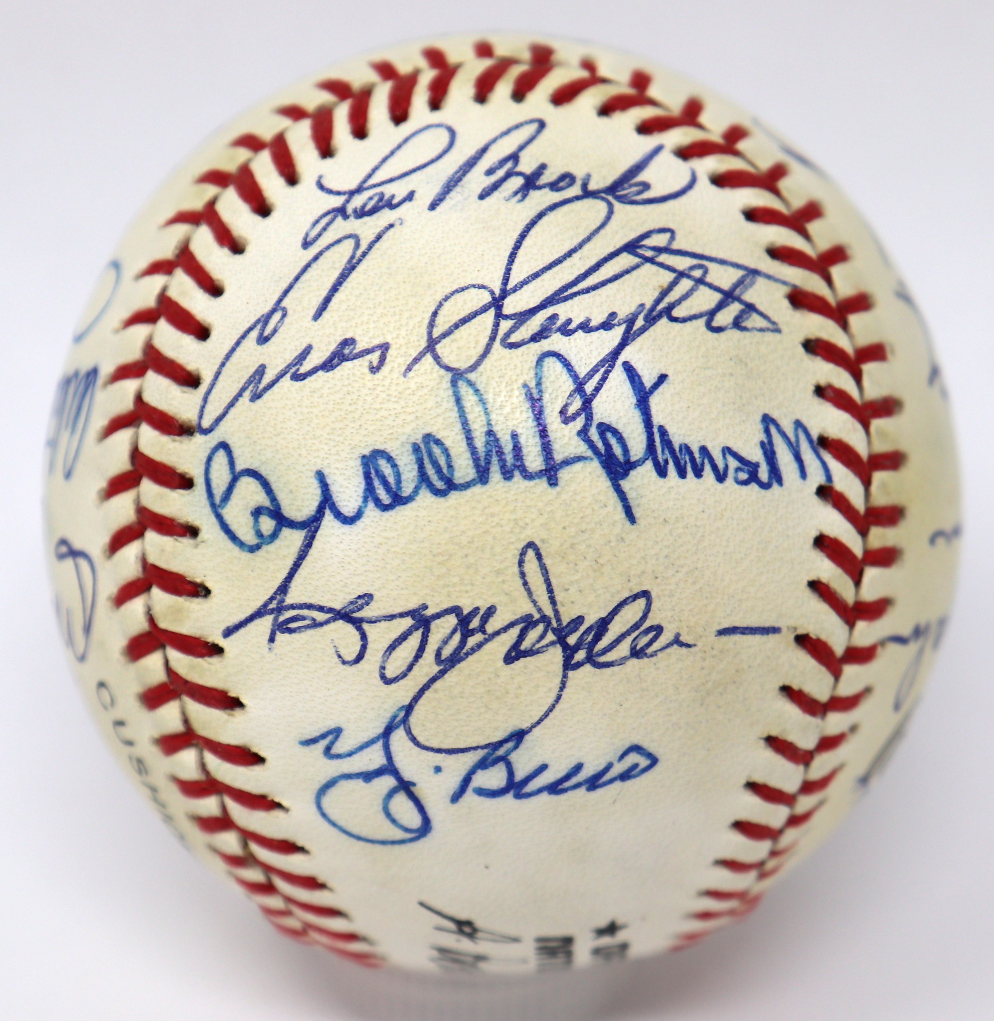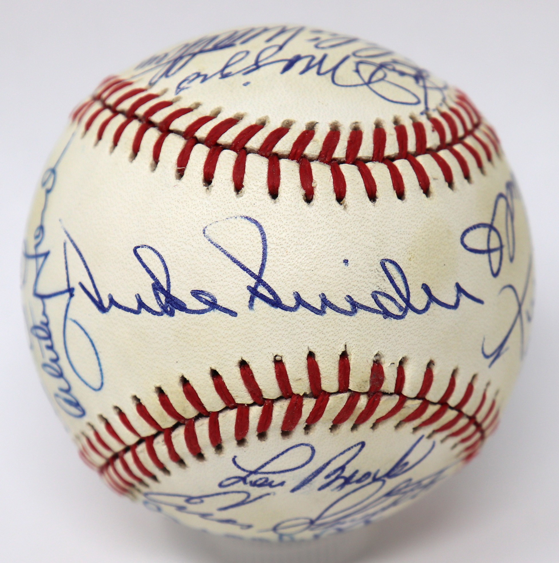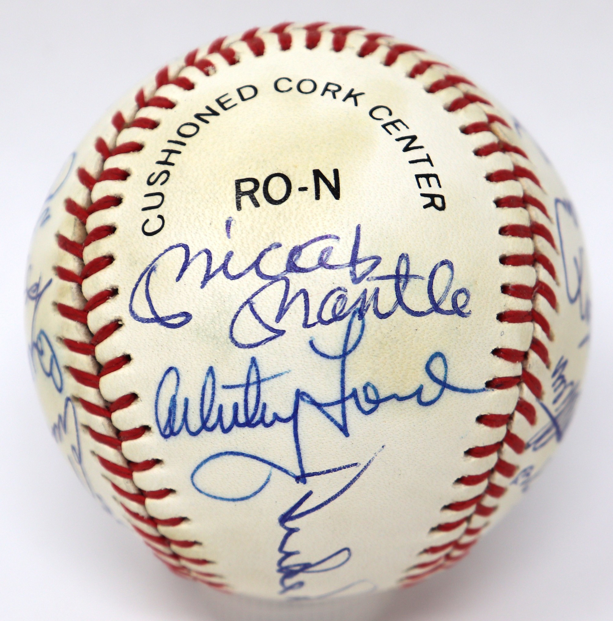 Description:Hall Of Famers multi-signed baseball with (18) autographs including Mantle, DiMaggio, Mays (EX-EX/MT). B.Giamatti official National League ball signed by (18) including Mickey Mantle, Joe DiMaggio, Willie Mays, Hank Aaron, Yogi Berra, Mike Schmiidt, Reggie Jackson, Brooks Robinson, Enos Slaughter, Lou Brock, Eddie Mathews, Steve Carlton, Frank Robinson, Bob Feller, Warren Spahn, Bob Lemon, Duke Snider, and Whitey Ford. Signatures rate 8 to 10 out of 10. Scattered areas of light to moderate toning: EX-EX/MT ($750-$1,000)