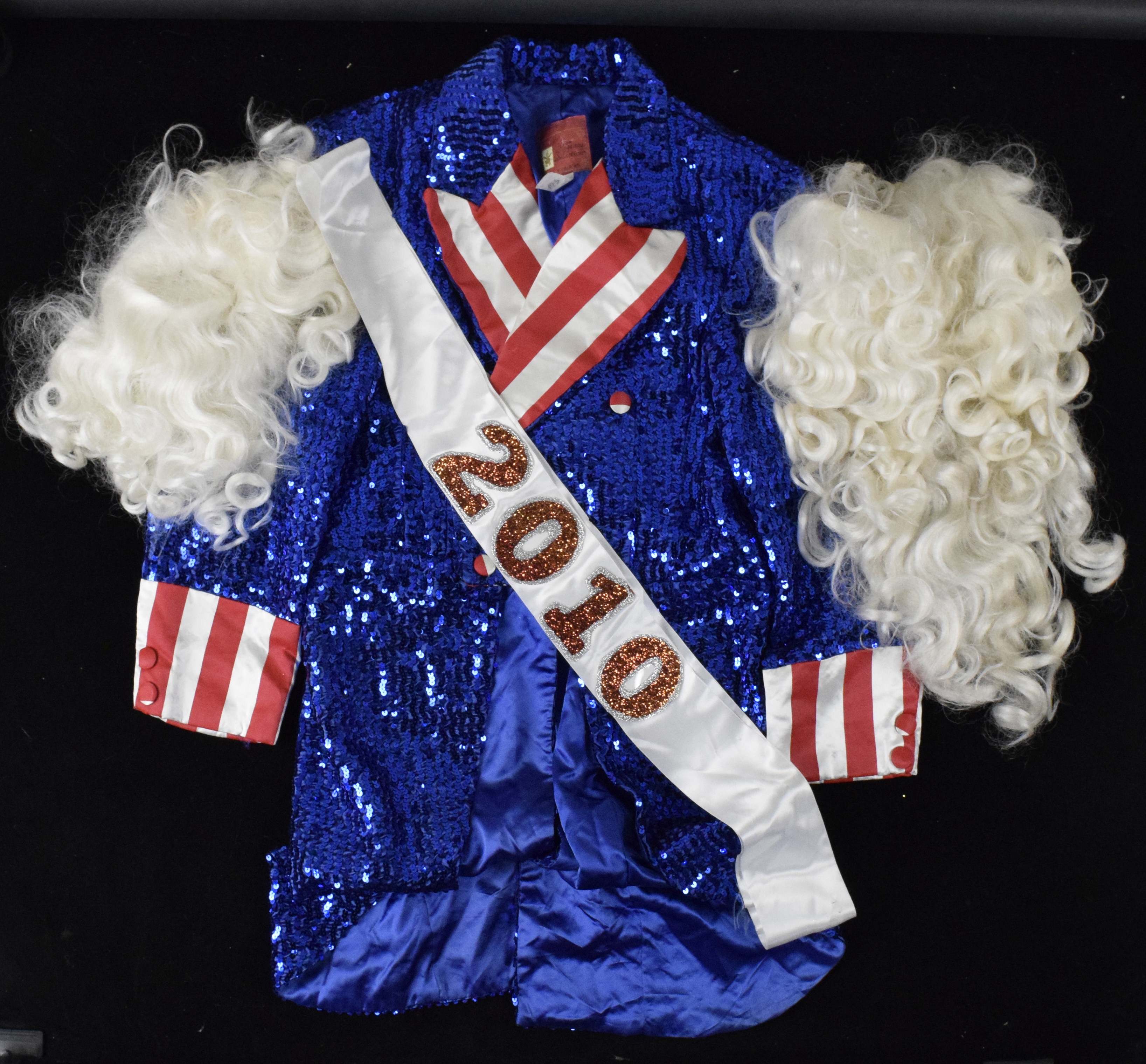 Description:Bill Walton's 2010 New Year's Eve "Father Time" outfit (EX-EX/MT). Uncle Sam style patriotic outfit worn by Walton for an appearance during Furthur's concert at the Bill Graham Civic Center in San Francisco. Includes beard, cloak, 2010 sash, wig, and certificate of provenance from Walton Family: EX-EX/MT ($750-$1,500)
