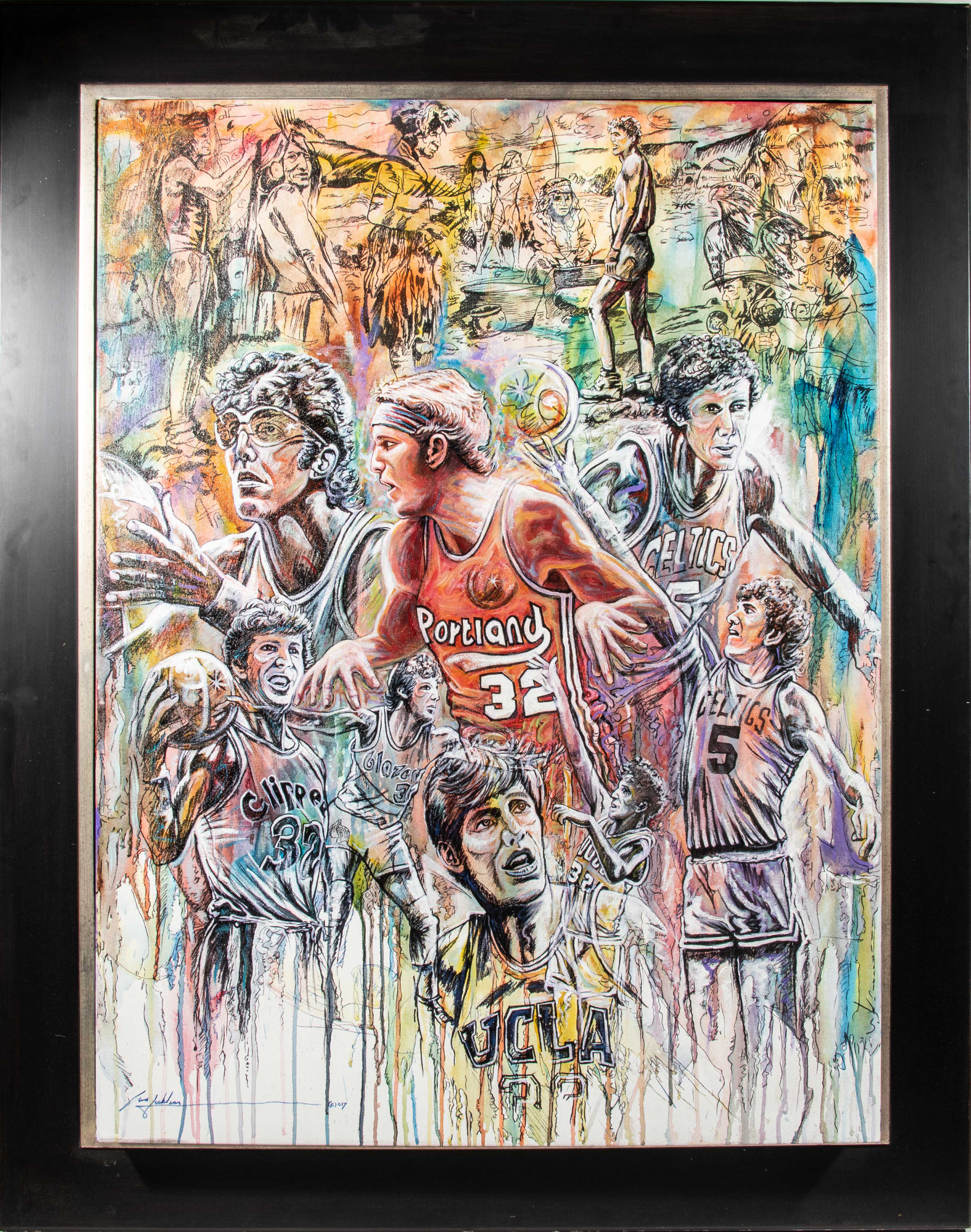 Description:Very impressive Bill Walton oversize original artwork signed by artist Gene Locklear (EX/MT). Approx. 47"x59" framed original work on canvas shows Walton in a number of scenes throughout his career. Signed by the artist, former baseball player Gene Locklear, atthe lower left corner. It was commissioned by Sycuan Casino, where Walton served as host for many Challenged Athletes Foundation events (a group for which Walton was an ambassador and fervent supporter). Includes certificate of provenance from the Walton Family: EX/MT ($500-$750)