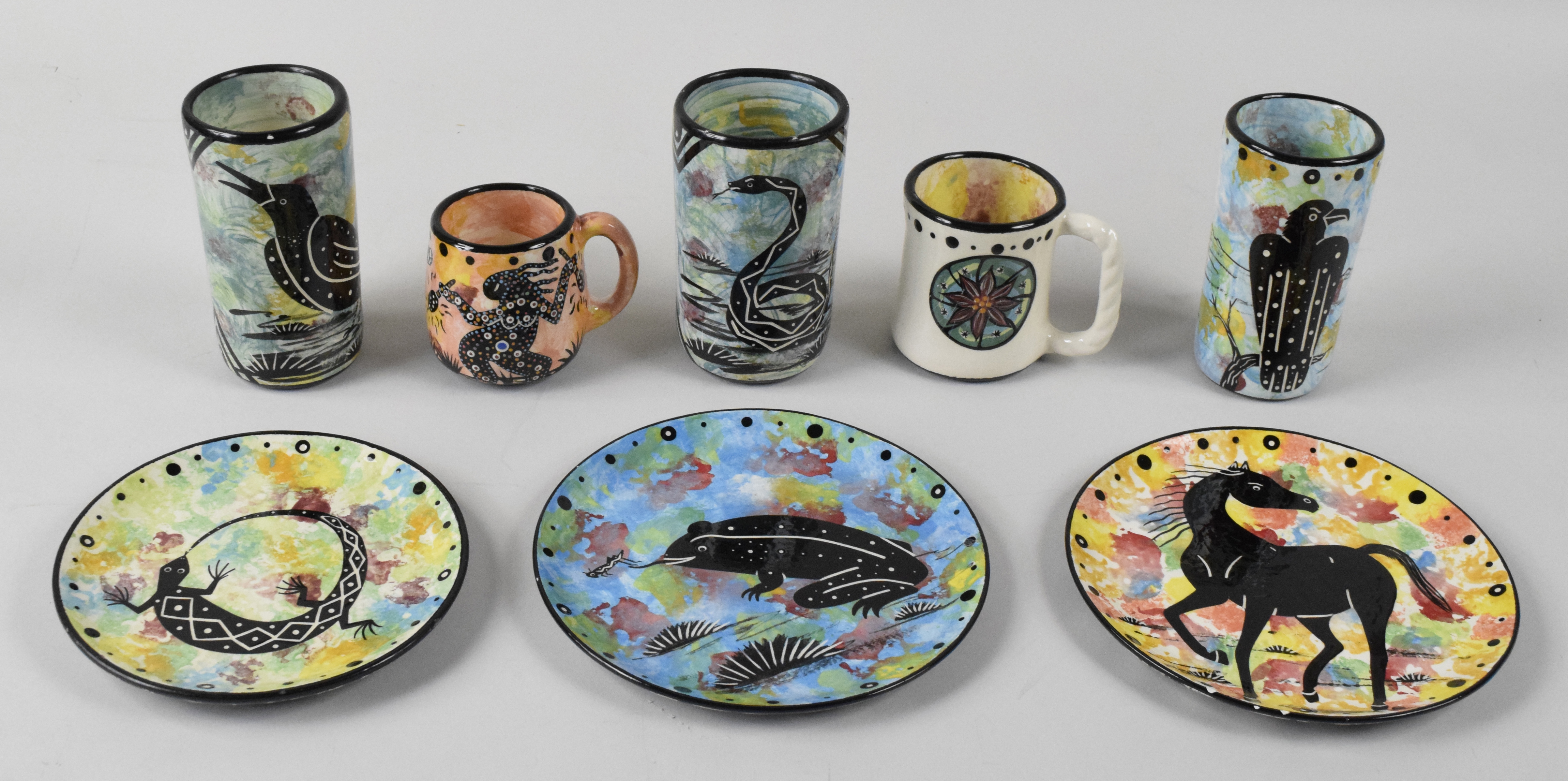 Description:Very nice lot of Mana Pottery from the Bill Walton Collection (VG-NM). Fine assortment of handmade pieces by Mana Pottery each having the company mark on the underside. Includes (7) bowls, (3) 6.25" glasses, (5) mugs of various sizes, and (18) plates of various sizes (24 of the pieces have Walton's name on the bottom). Various conditions throughout the lot. Most appear to average EX overall with some scattered chips and nicks. Includes a Mana Inc. size XL Peyote Spirit t-shirt, Peyote Way Church Of God prayer, and certificate of provenance from Walton Family: VG-NM ($500-$750)
