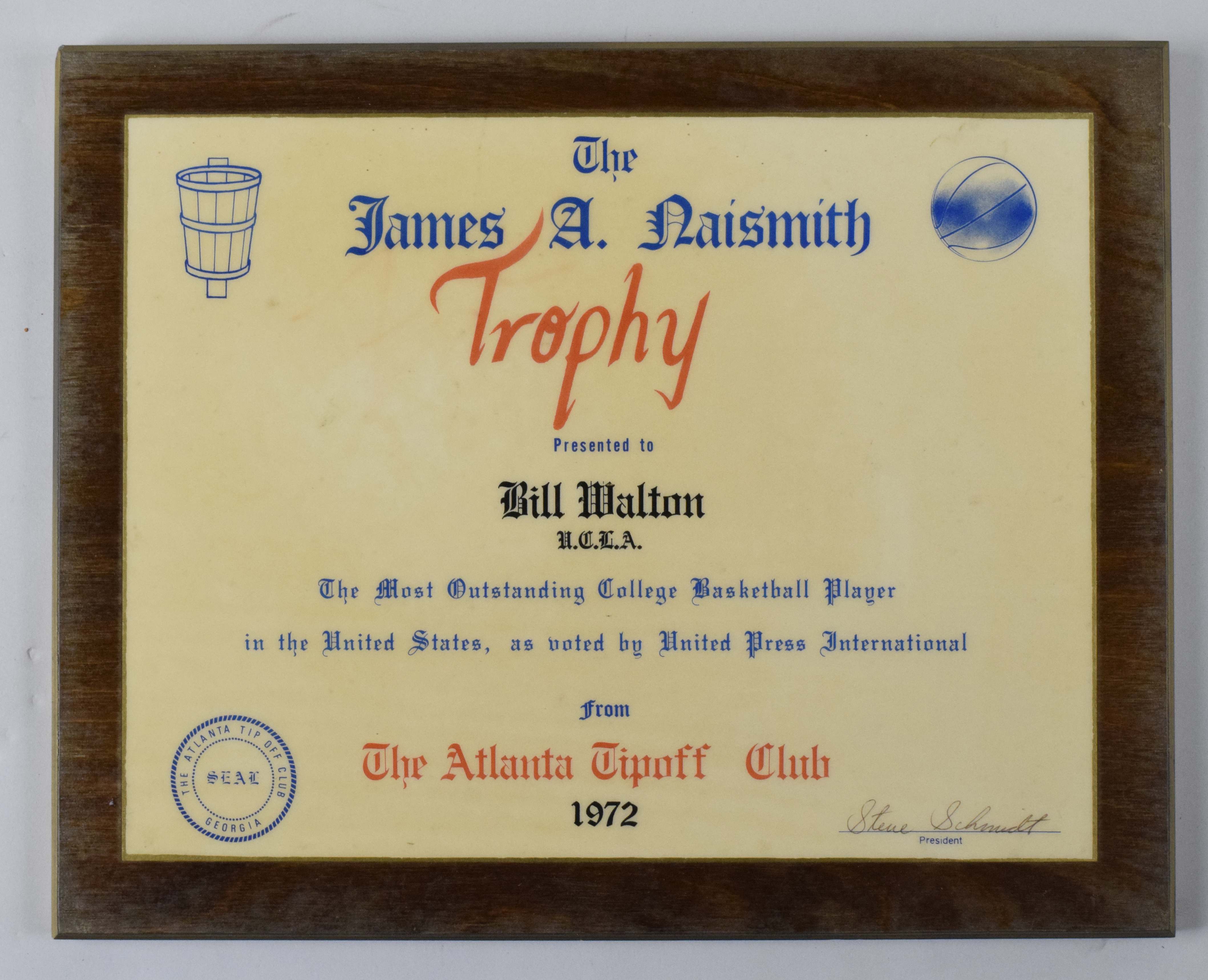 Description:Bill Walton 1972 Naismith Most Outstanding College Basketball Player award plaque (EX/MT). One of two issued (one to the player and one to the university), this significant 13"x16" wooden plaque was presented in recognition of having been named as the Most Outstanding College Basketball Player by the United Press International. The plaque is titled to Bill Walton, and he remains as one of only two players to be a 3-time winner of the award. Minor surface wear. Includes certificate of provenance from Walton Family: EX/MT
