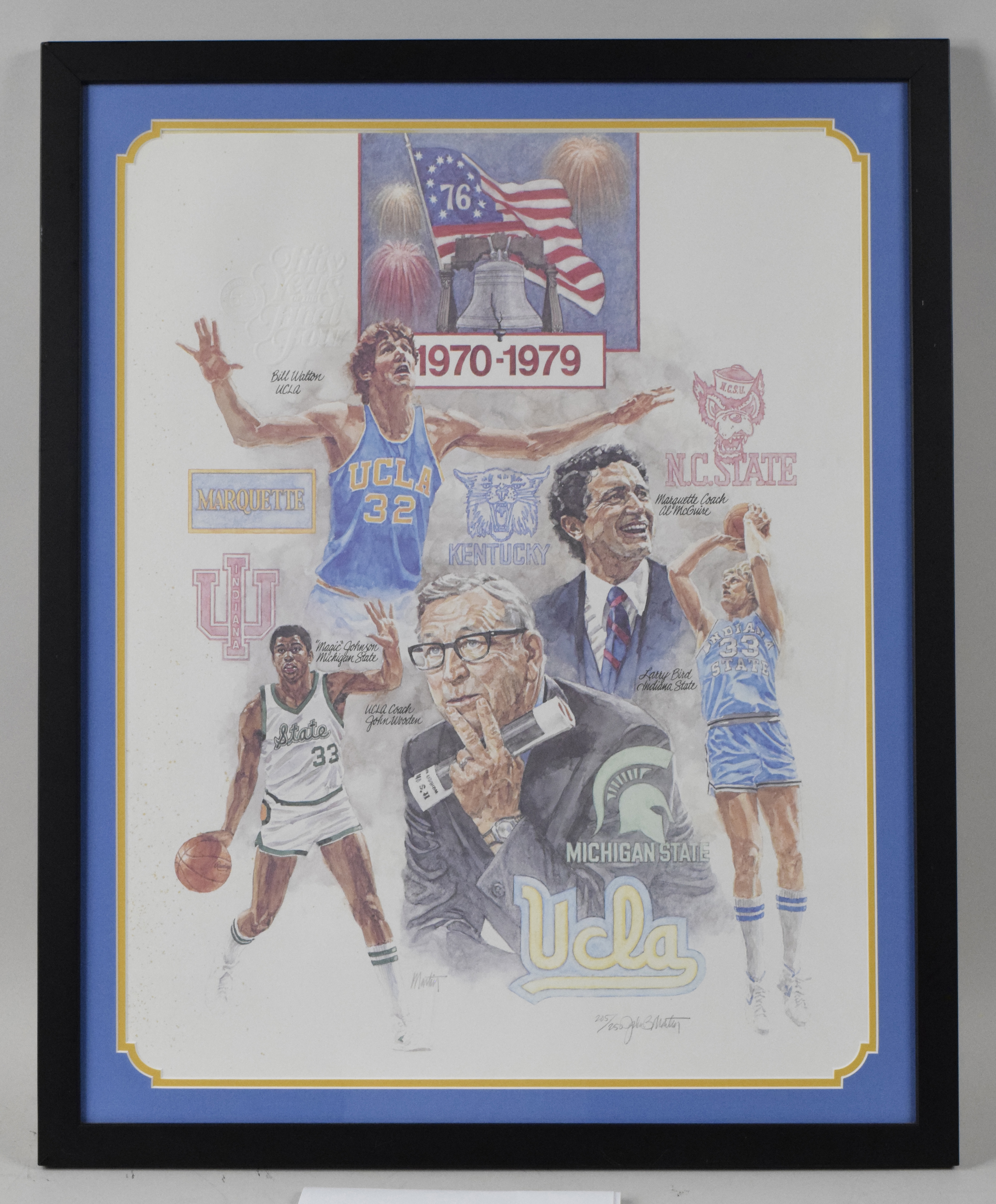 Description:Bill Walton's limited edition Fifty Years Of The Final Four framed lithograph signed by artist John B. Martin (EX). Approx. 26"x32" framed 1970s edition depicting Walton, John Wooden, Larry Bird, Al McGuire, and Magic Johnson. Signed by John B. Martin, and #ed 205/250. Due to framing, complete condition is unknown, but spots of toning can be seen at the left edge. Includes certificate of provenance from Walton Family: EX