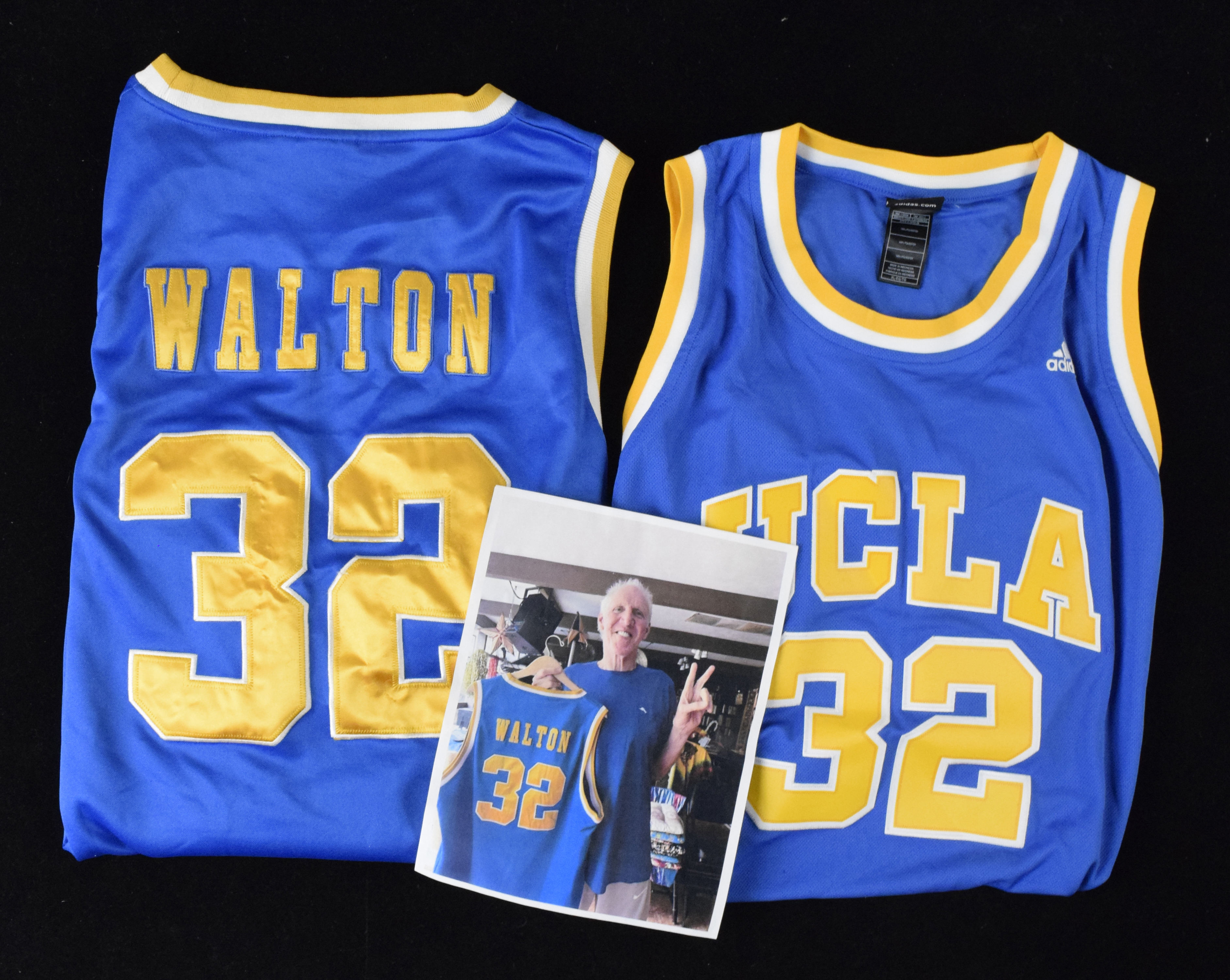 Description:Lot of (2) Bill Walton UCLA throwback jerseys with related photograph (EX-NM). Includes True School Authentics size 54 UCLA Bruins #32 Bill Walton jersey with 8.5"x11" printed off photo picturing Walton holding the jersey, Adidas size XL UCLA #32 Bill Walton jersey, and certificate of provenance from Walton Family: EX-NM
