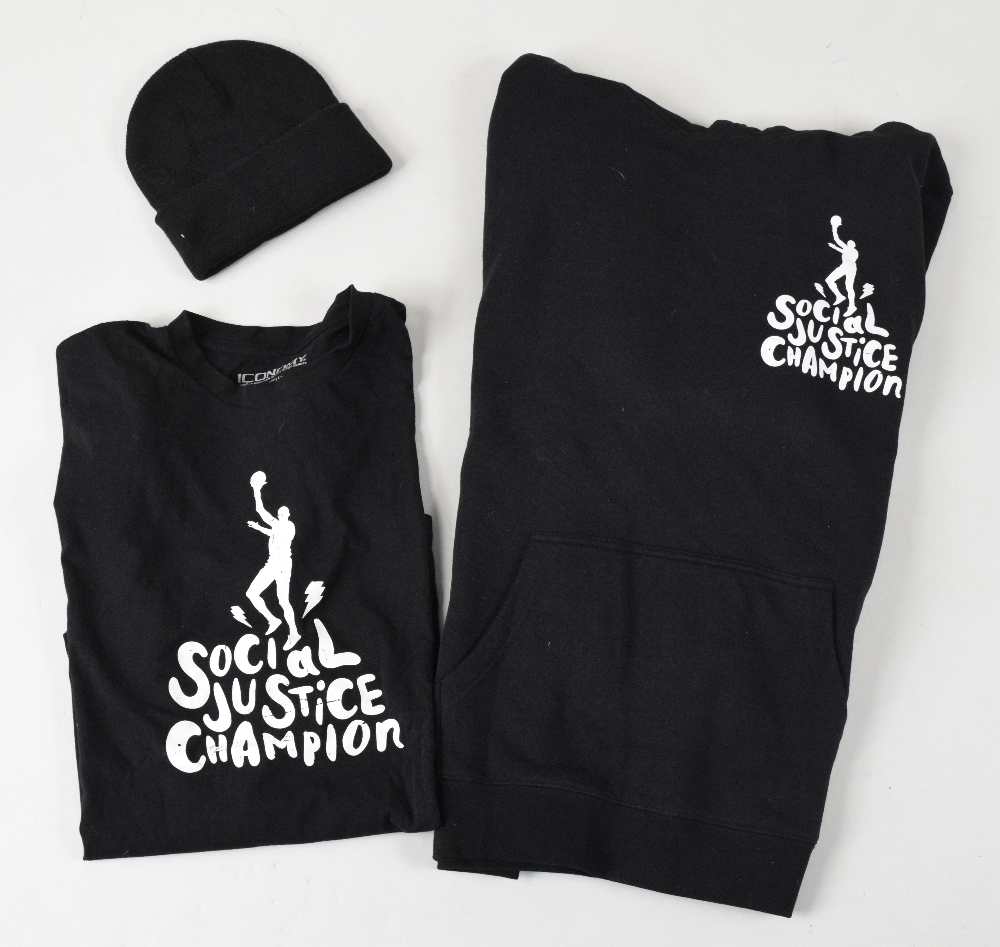Description:Bill Walton's Social Justice Champion apparel (NM-NM/MT). Includes size XL hoody, size XL t-shirt, knit hat, and bag, all with Social Justice Champion logo, and includes certificate of provenance from Walton Family: NM-NM/MT