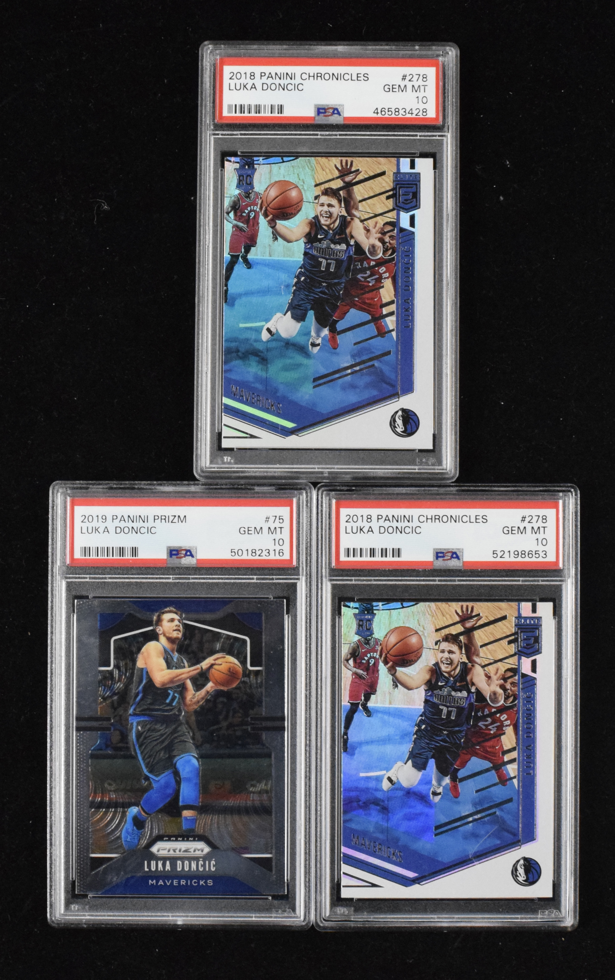 Description:Lot of (3) Luka Doncic PSA 10 graded basketball cards including two rookies (GEM MINT). Includes (2) 2018-19 Panini Chronicles #278 Doncic (both PSA 10 GEM MINT), and 2019-20 Panini Prizm #75 Doncic (PSA 10 GEM MINT).