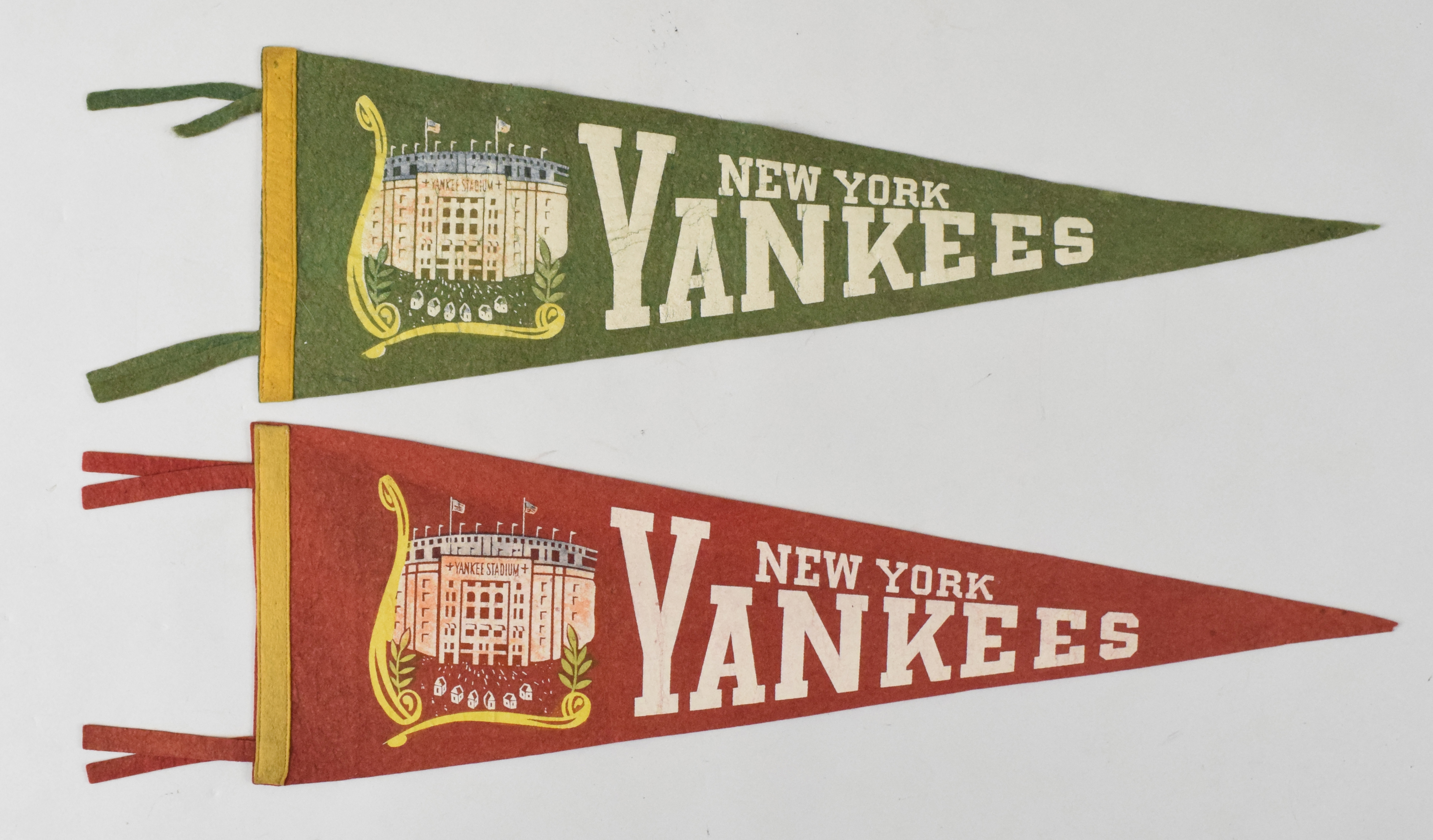 Description:Lot of (2) vintage New York Yankees pennants, c.1940s-50s (EX-EX/MT). 25" green pennant and 26" red pennant both with Yankee Stadium graphic. Green grades EX and red grades EX-EX/MT.