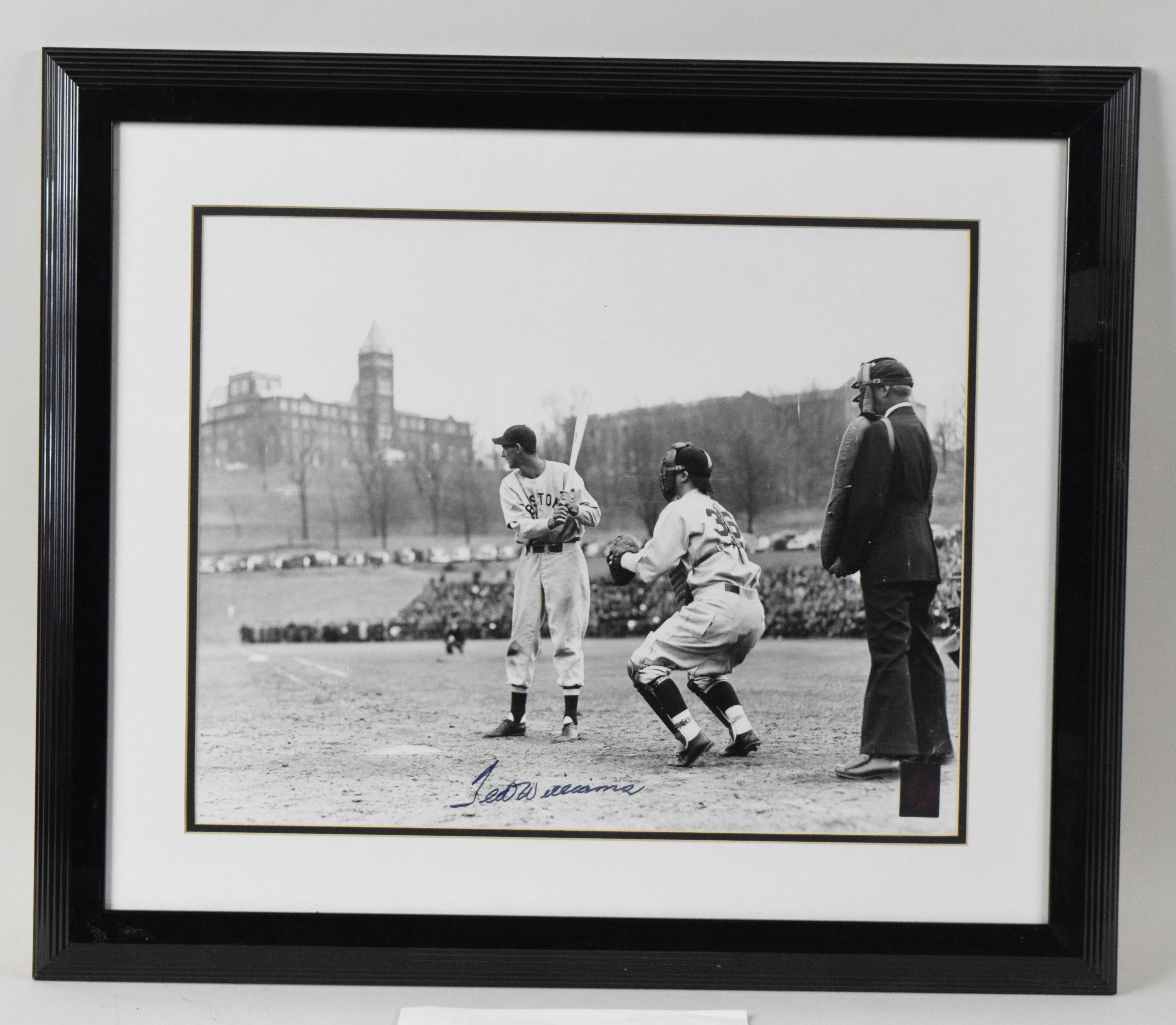 Description:Ted Williams signed oversize framed photograph - Green Diamond Sports (NM). Frame measures approx. 23.5"x27". Williams signed the photo in blue marker. Signature rates 9/10 out of 10. Includes COA from Green Diamond Sports, along with hologram sticker on the photo. Due to framing, complete condition is unknown: NM appearance