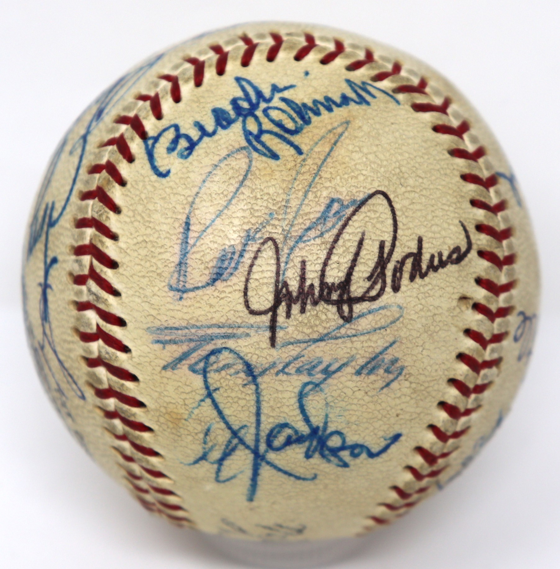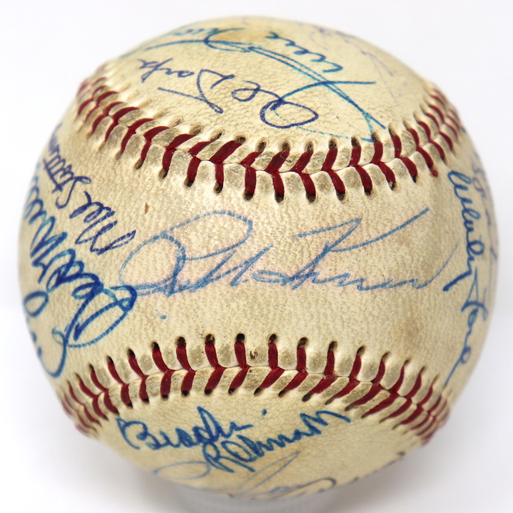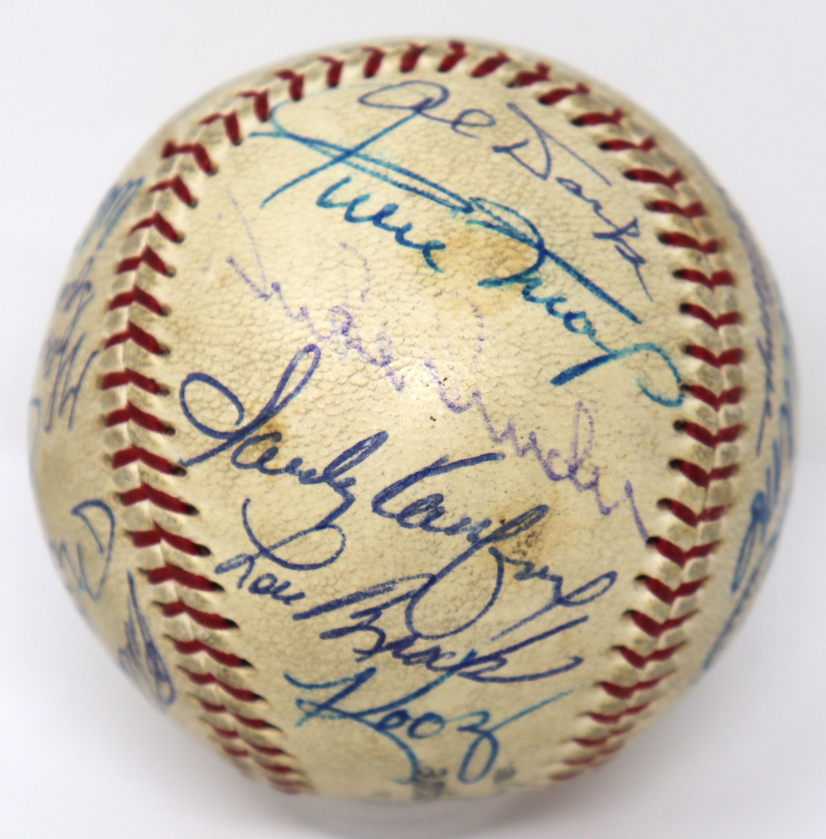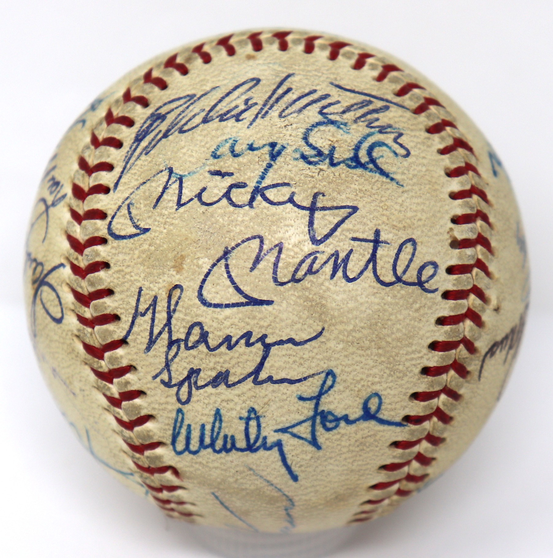 Description:Vintage stars & Hall Of Famers multi-signed baseball with (21) autographs including Williams & Mantle, c.1960s (EX). W.Giles National League ball signed by (21) including Mickey Mantle, Ted Williams, Hank Aaron, Willie Mays, Ralph Kiner, Sandy Koufax, Brooks Robinson, Duke Snider (faded), Lou Brock, Eddie Mathews, Warren Spahn, Whitey Ford, Tony Oliva, Mel Stottlemyre, Al Dark, Johnny Podres, Tony Taylor, Jerry Koosman (signed "Kooz"), and others. Signatures rate 5/6 (Snider) to 9/10 (avg 8) out of 10. The ball appears used (but not extreme) with surface soiling: EX ($750-$1,500)