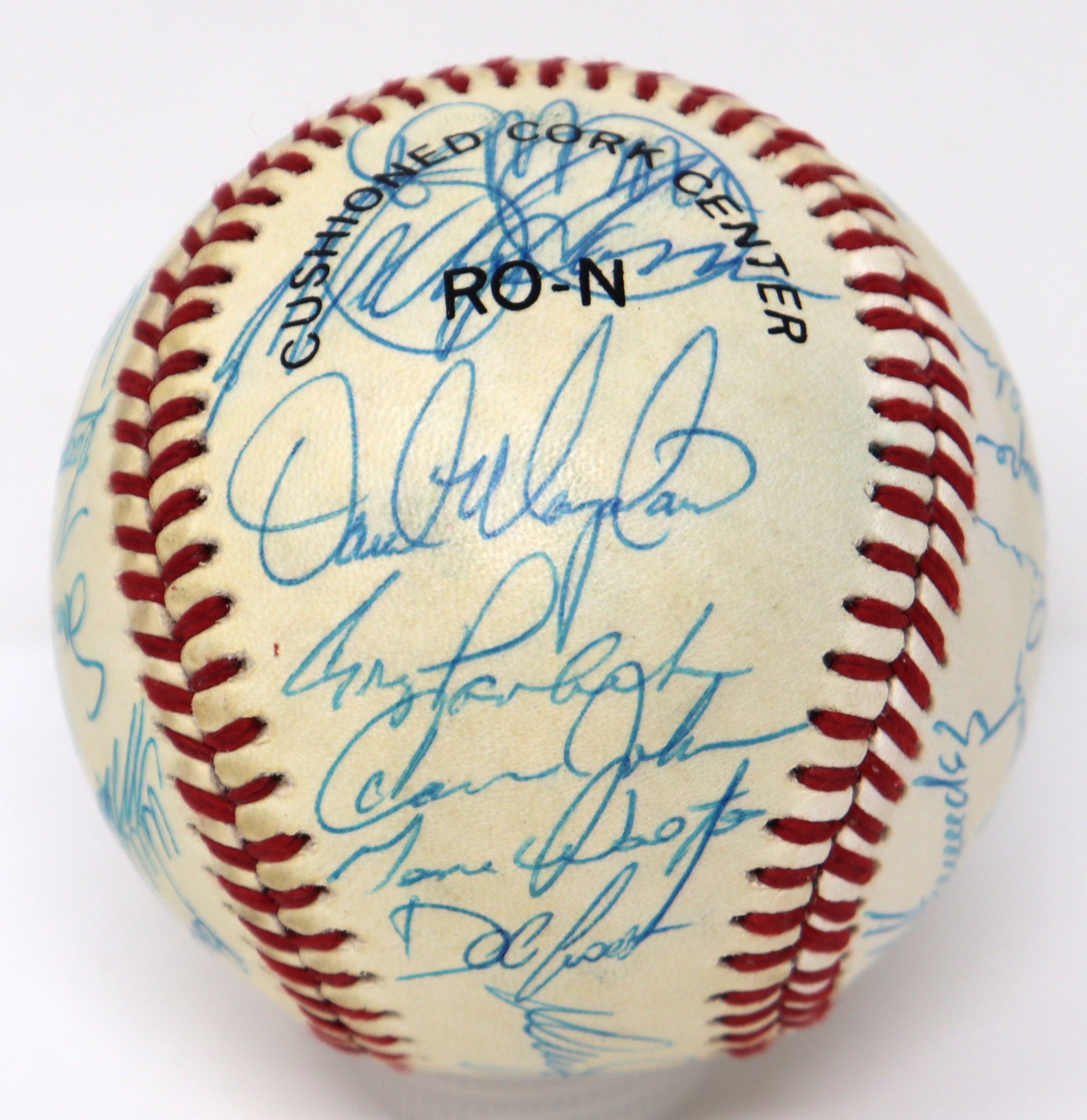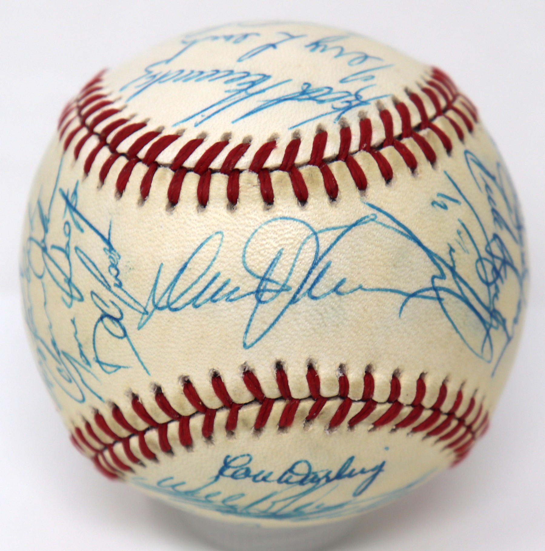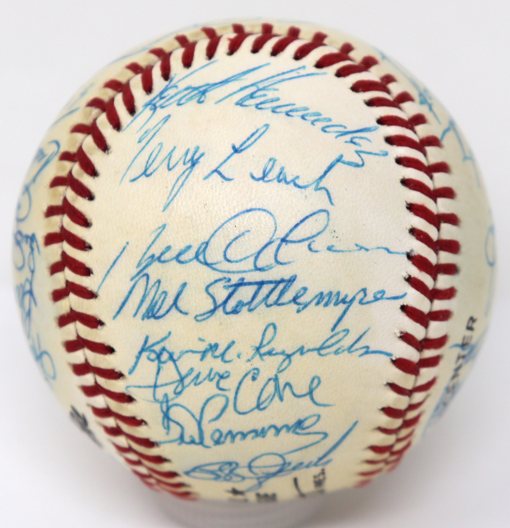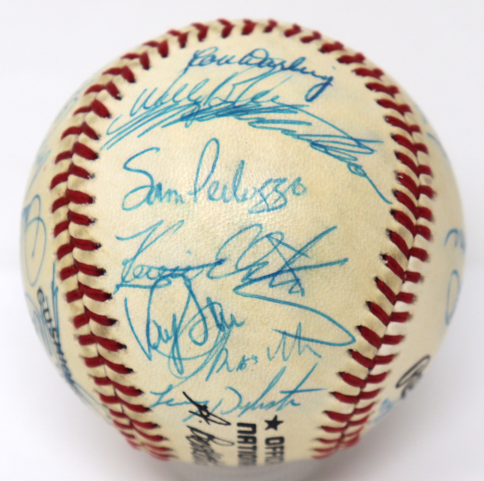 Description:1987 New York Mets team signed baseball (EX/MT). B.Giamatti National League ball signed by (30) including Davey Johnson, Gary Carter, Keith Hernandez, David Cone, Darryl Strawberry, Lenny Dykstra, Howard Johnson, Doc Gooden, Ron Darling, Kevin McReynolds, Roger McDowell, Randy Myers, Wally Backman, Sid Fernandez, Mookie Wilson, Mel Stottlemyre, and others. Signatures rate 7/8 to 9/10 out of 10. Light toning on each panel: EX/MT