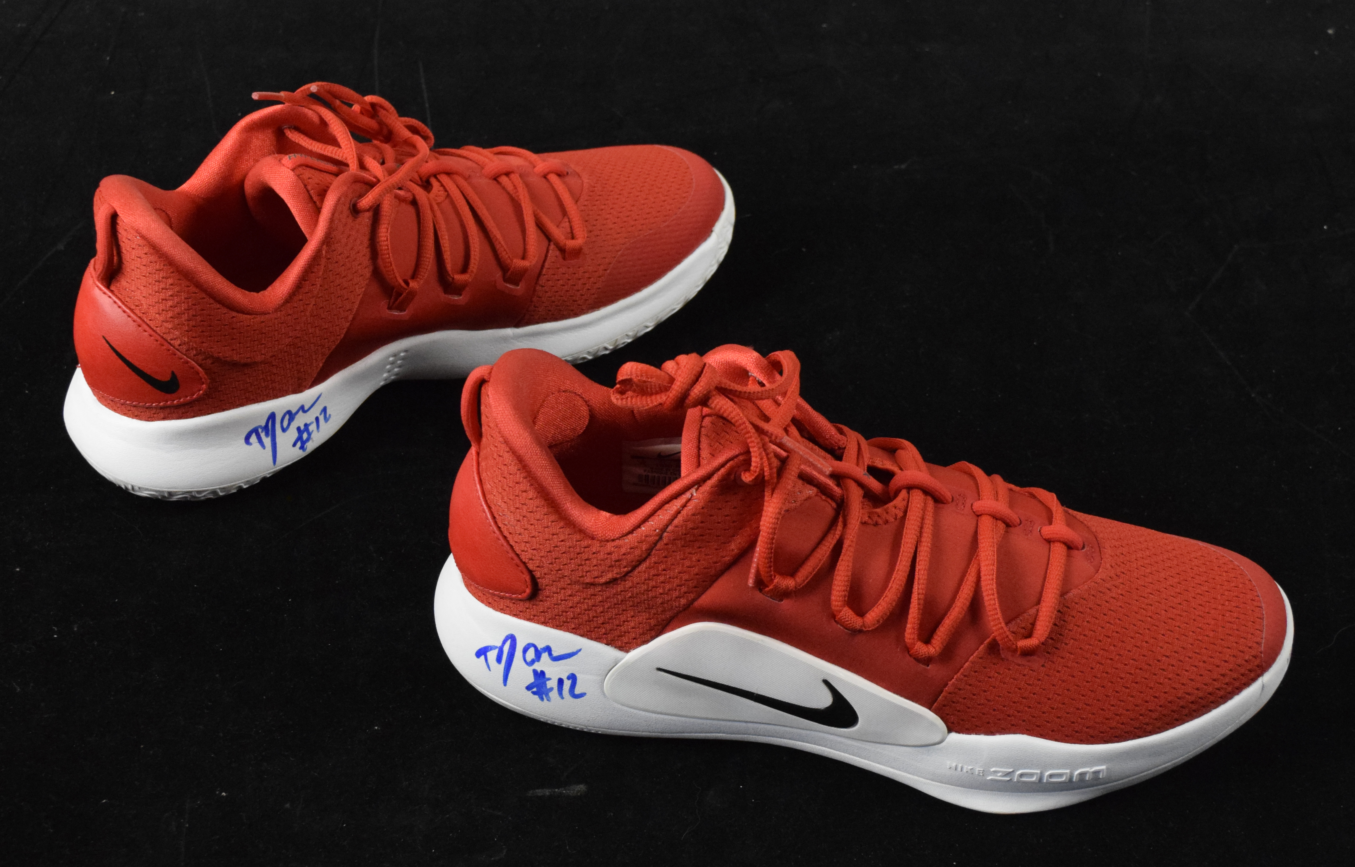 Description:T.J. McConnell signed professional model basketball shoes, c.2018 (EX/MT-NM). Nike Zoom Hyperdunk size 12 shoes both signed by McConnell in blue marker. Signatures rate 8 to 9 out of 10. Appear only lightly worn, if at all: EX/MT-NM