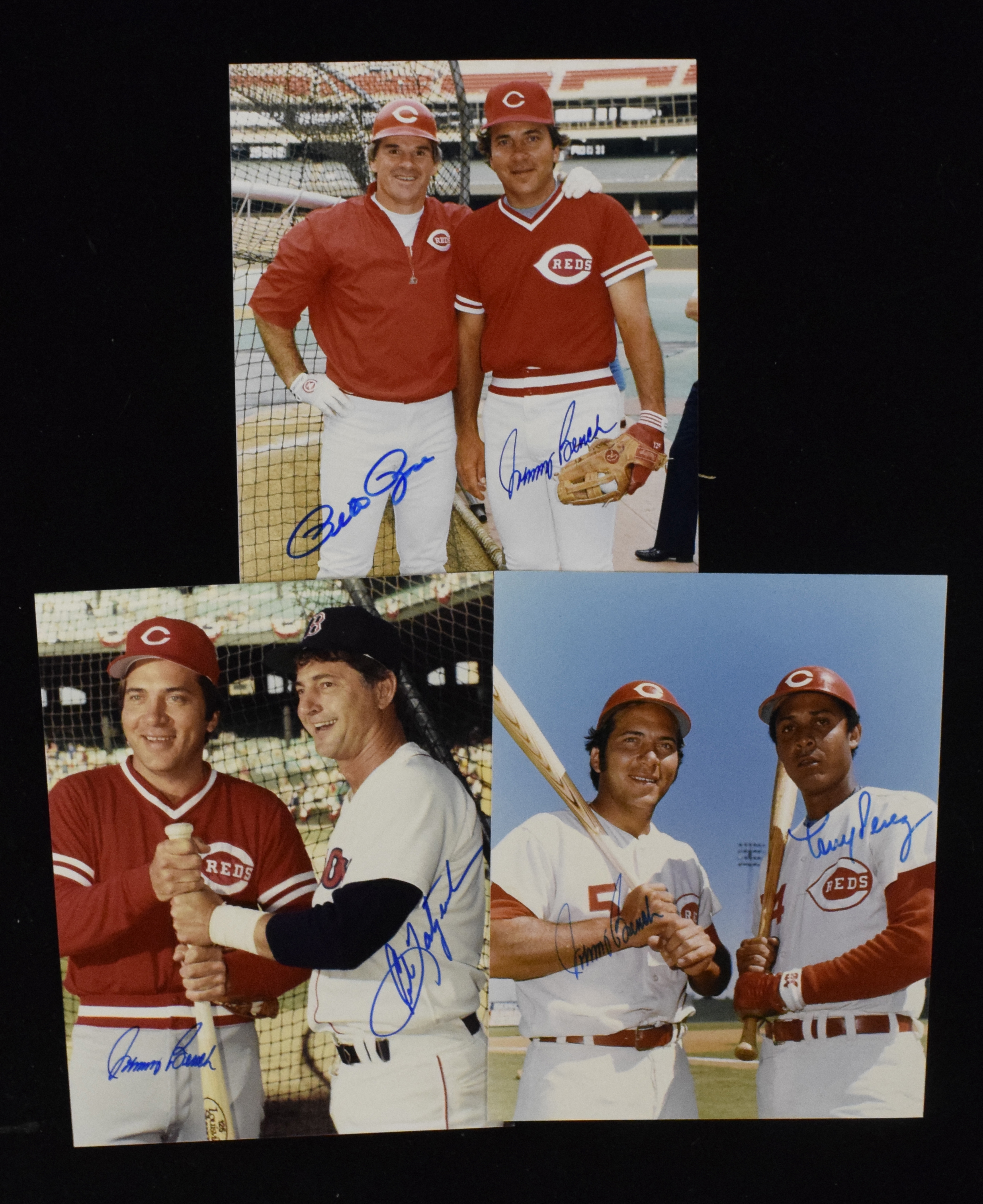 Description:Nice lot of (3) Johnny Bench and others dual-signed 8"x10" photographs (EX-NM) Includes photos of Bench and Pete Rose, Bench and Tony Perez, and Bench and Carl Yastrzemski. Marker signatures rate 8 out of 10 or better with the Bench/Perez a touch lesser: EX-NM