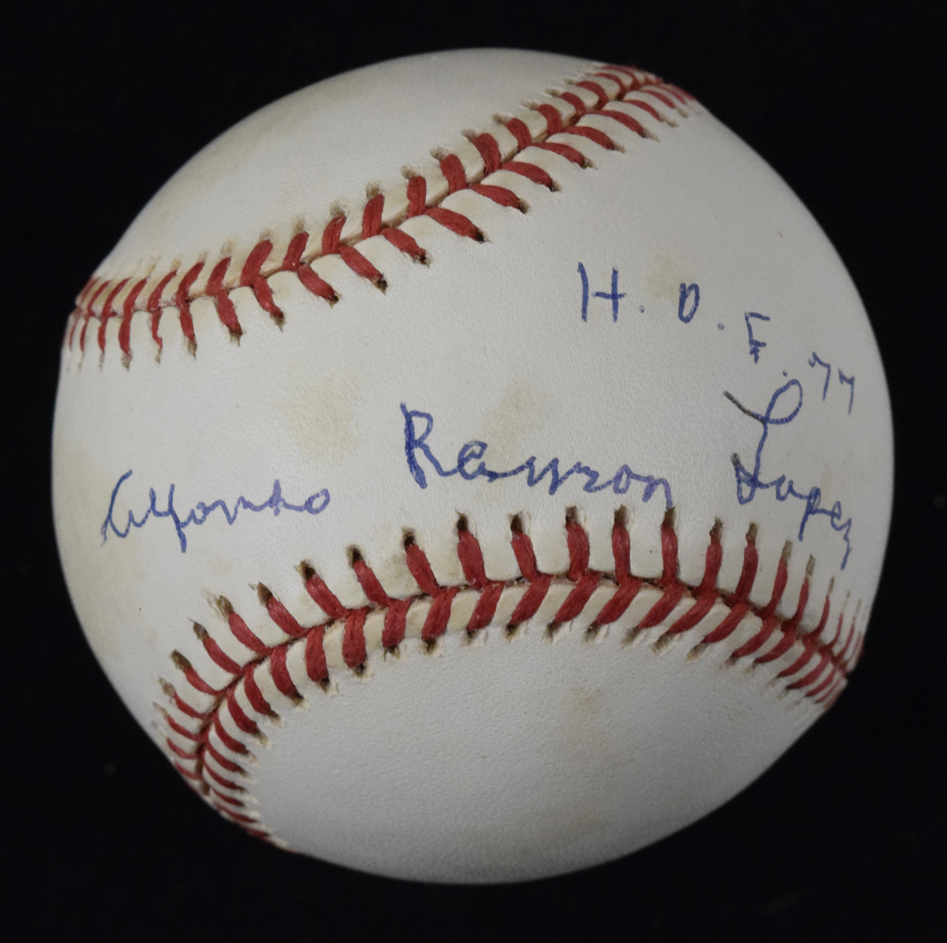 Description:Al Lopez full name signed and HOF inscribed baseball (EX/MT-NM) Rawlings G.Budig Official American League baseball has been signed "Alfonso Ramon Lopez H.O.F. 77" in ink rating 8/9 out of 10. Light scattered toning spots: EX/MT-NM