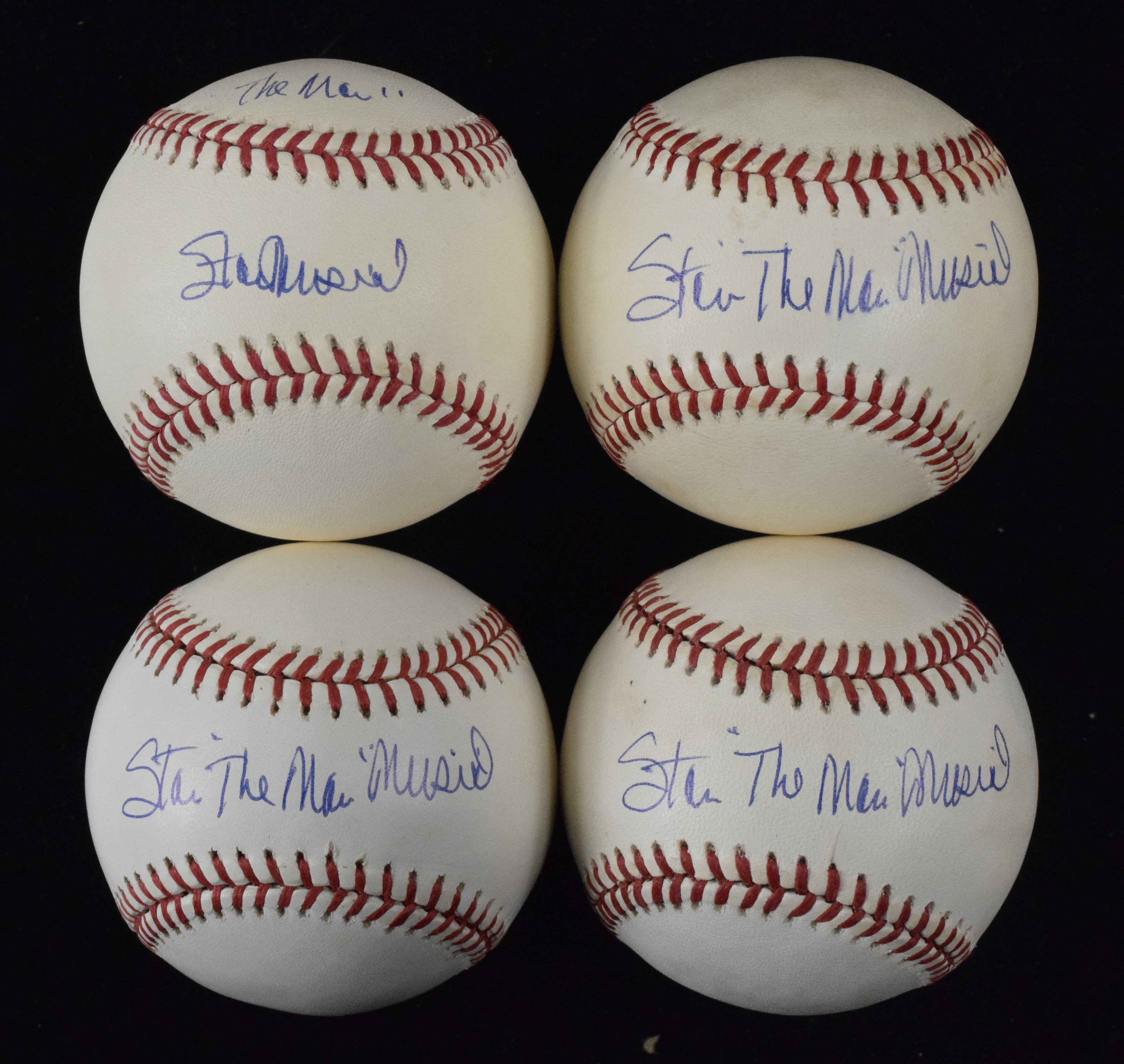 Description:Lot of (4) Stan "The Man" Musial single signed baseballs (EX-NM) Rawlings W.White Official National League baseballs are each signed in ink rating 8 to 8/9 out of 10. Light toning is a touch more accentuated on one piece: EX-NM
