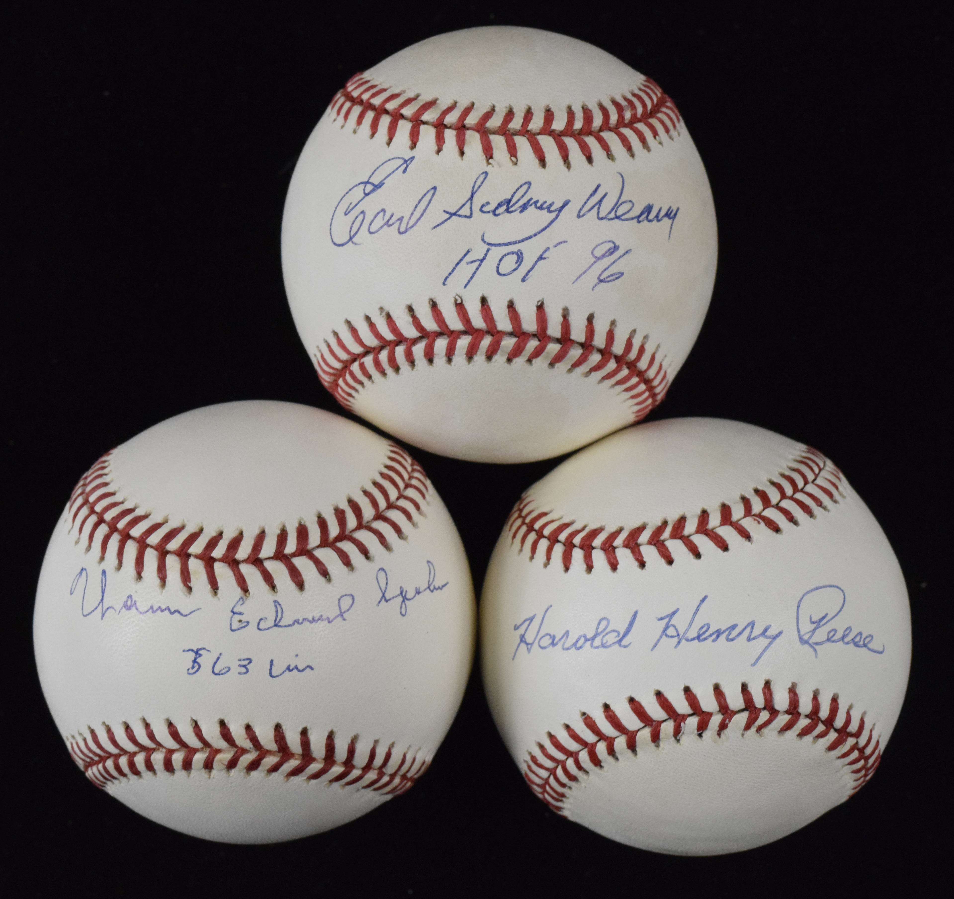 Description:Lot of (3) Hall of Famer full name single signed baseballs (EX/MT-NM) Rawlings Official American or National League baseballs, each signed with full name including Pee Wee Reese, Warren Spahn, and Earl Weaver. The Spahn has a win total inscription and Weaver has HOF. Some light scattered spotting/toning: EX/MT-NM