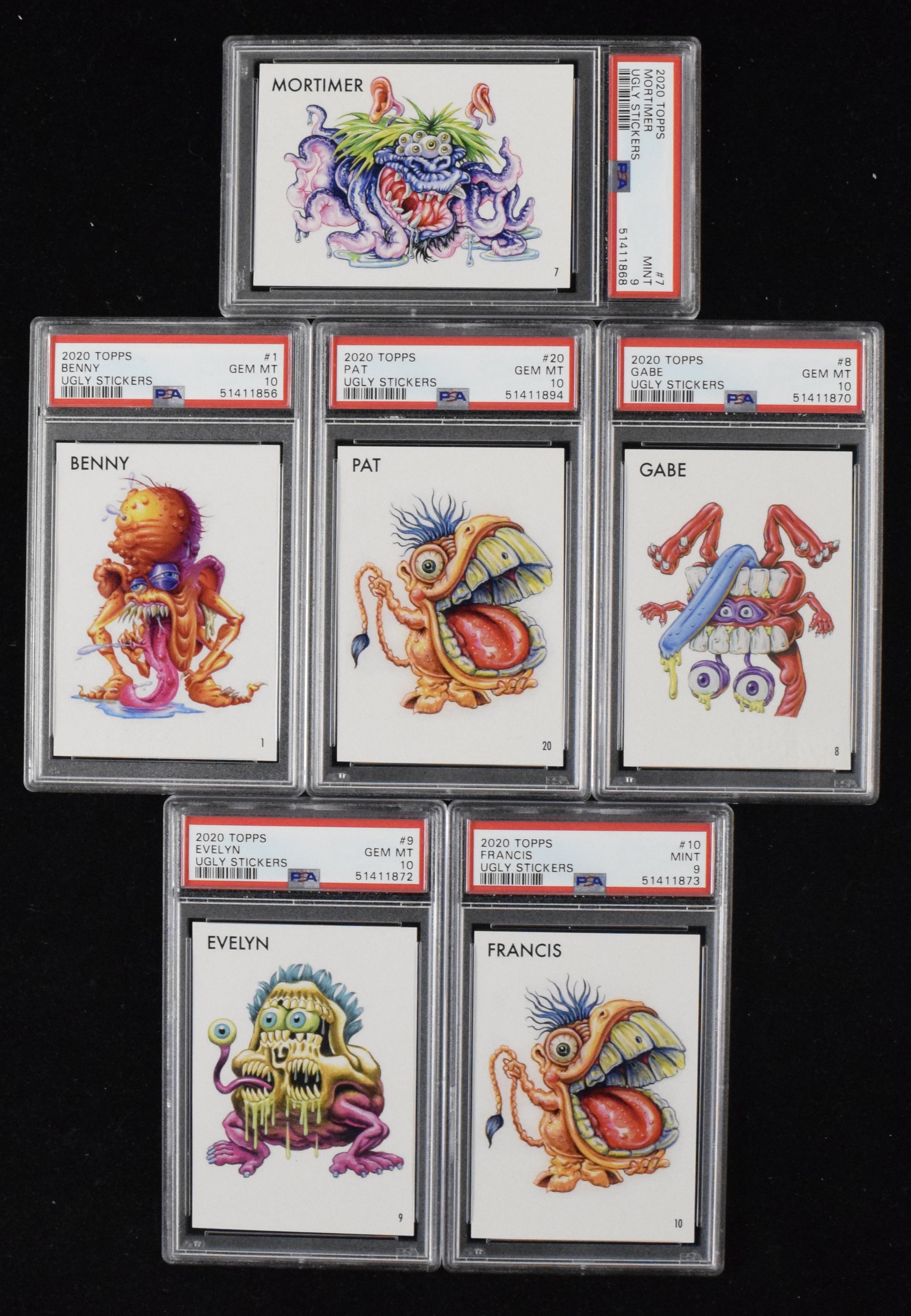 2020 Topps Ugly Stickers complete PSA-graded set (20)(PSA 8 NM/MT - PSA 10 GEM MT). Modern Topps gross-out nonsports issue features (20) different cards, with each graded by PSA. Includes (8) PSA 10 GEM MT: #s 9, 8, 5, 4, 1, 20, 18 and 11; (11) PSA 9 MT: #s 10, 7, 6, 3, 2, 17, 16, 15, 14, 13 and 12 and (1) PSA 8 NM/MT: #19. Range: PSA 8 NM/MT - PSA 10 GEM MT.