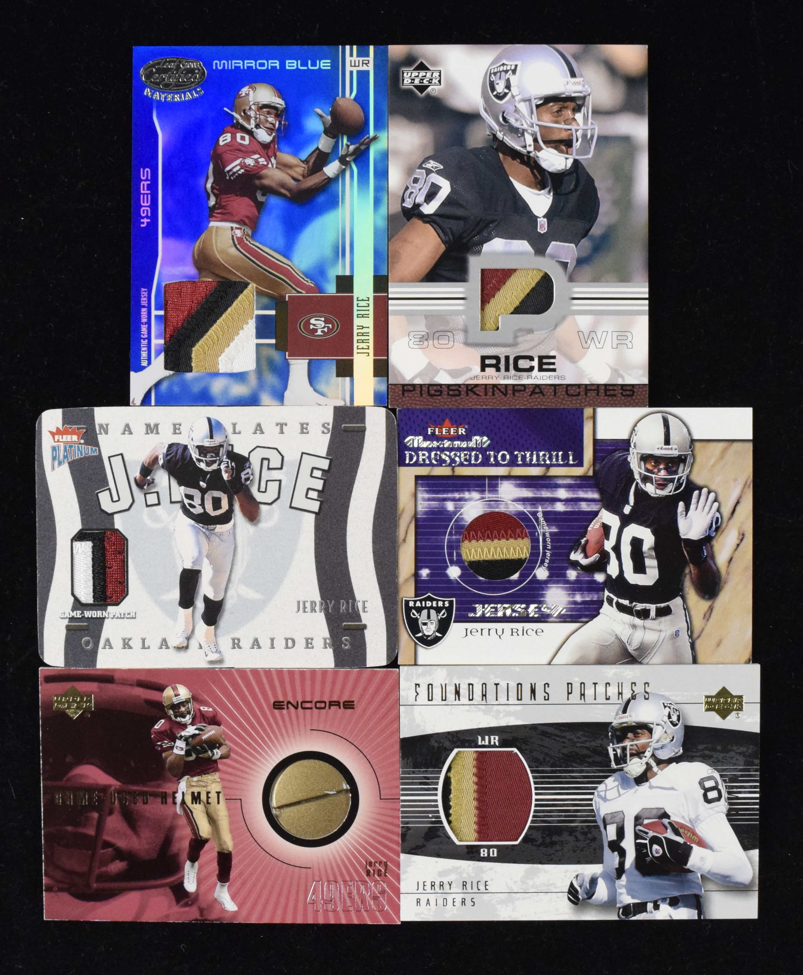 Lot of (6) 1999-2004 Jerry Rice patch insert cards (2 numbered) (EX-NM) Includes 1999 Upper Deck Encore "Game-Used Helmet" helmet patch; 2002 Fleer Maximum Dressed To Thrill patch; 2002 Upper Deck Pigskin Patches patch; 2002 Fleer Platinum Nameplates pathc (9/35); 2003 Leaf Certified Mirror Blue patch (80/50); 2004 Upper Deck Foundations patch. Touch of light scattered wear: EX-NM