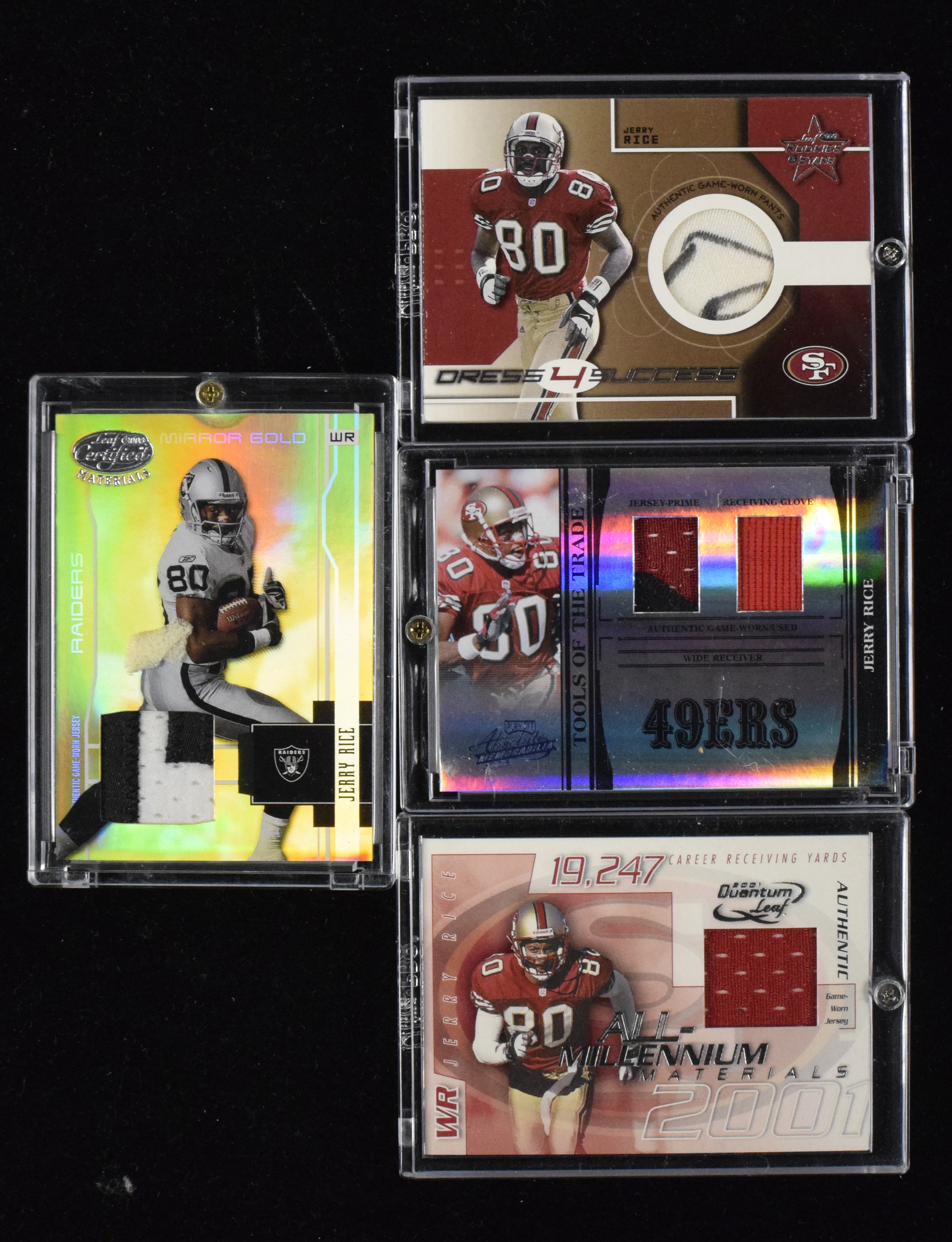 Lot of (10) 1999-2006 Jerry Rice patch insert cards (some numbered) (EX-NM) Includes 1999 Donruss Elite Common Threads patch (33/150); 2000 Rookies & Stars Dress 4 Success patch (98/300); 2001 Pacific Prism Atomic Patch Variation patch; 2001 Quantum Leaf All-Millenium Materials patch (37/100); 2001 Donruss Elite Throwback Threads patch (14/100); 2001 Playoff Honors Game Day Jerseys patch; 2002 Playoff Piece of the Game patch (233/250); 2003 Leaf Certified Materials Mirror Gold patch (8/25); 2004 Leaf Limited Limited Threads patch (5/100); 2006 Playoff Absolute Tools of the Trade dual patch (11/25). Touch of light scattered wear: EX-NM