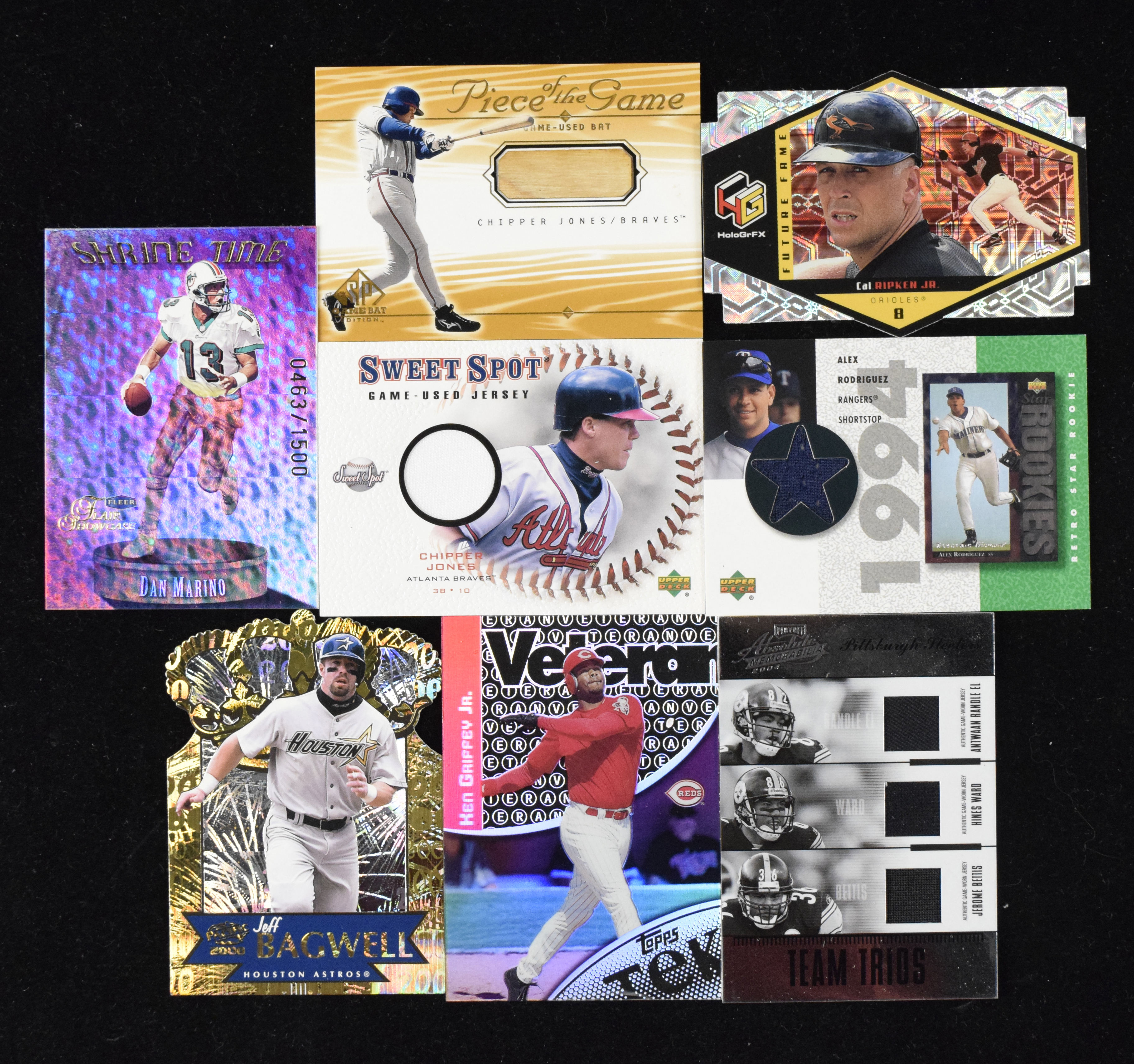 Description:Large lot modern sportscards with excellent breakdown value (HOFers, stars, swatch, auto, etc) (EX-NM) Large lot of modern sportscards with a good number of Hall of Famers and stars with most dating to the late 1990s and 2000s but there are a handful earlier. The group fills a bit more than two and half two row storage boxes with nearly all cards in toploaders. There are a variety of product lines and cards include inserts, parallels, serial numbered, etc. There are some autographed inserts and/or swatch/relic. Good dollar box breakdown value and there are many cards mixed in which would be valued at higher levels. Good number of Rookie cards mixed in however please keep in mind that there are portions which would be considered "common" players. There are a healty number of patch/relic cards including at least (60) baseball Hall of Famers and stars. An inventory is not feasible but a sampling of players represented (some on one card, others on many) includes Ken Griffey Jr, Alex Rodriguez, Cal Ripken Jr, Mark McGwire, Randy Moss, Kordell Stewart, Barry Sanders, Randy Moss, Troy Aikman, Ricky Williams, Donovan McNabb, Tony Gonzalez, Drew Brees, Chipper Jones, Tony Gwynn, Dan Marino, and many others. Mostly light scattered wear: EX-NM