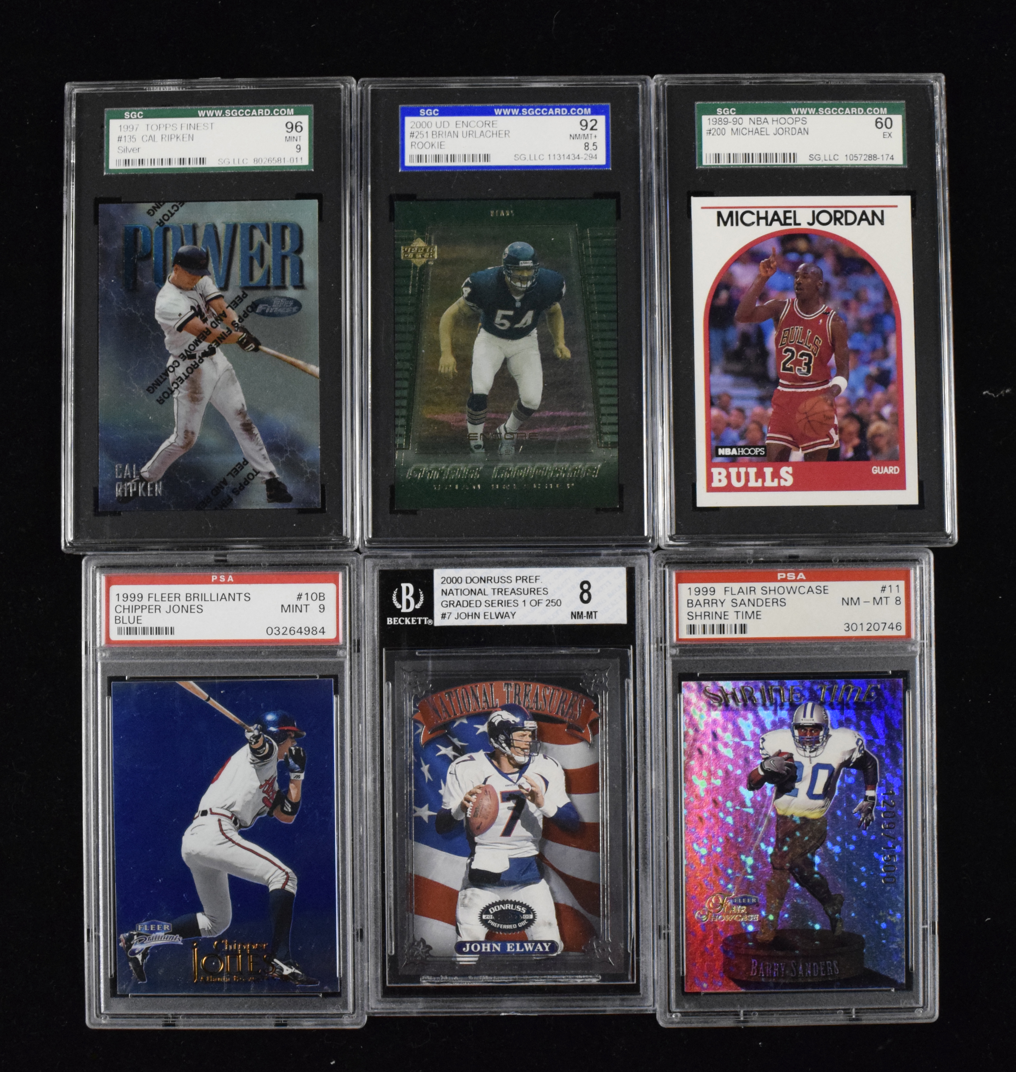 Description:Lot of approx. (180) graded modern sportscards with some Hall of Famers and stars (See description) Large lot of graded cards includes PSA, BGS, and SGC along with a handful of "lesser" or now defunct company holders and maybe a handful of BCCG holders. All are "value box" type cards with the majority being "common." Better names include Marcus Allen, Drew Bledsoe, Junior Seau, John Elway, Steve Young, Rafael Palmiero, Frank Thomas, Brian Urlacher, Cal Ripken Jr, Michael Jordan, Sammy Sosa, Dan Marino, Troy Aikman, Barry Sanders, Valdimir Guerrero, Kurt Warner, Peyton Manning, Terrell Davis, Mark McGwire, John Elway, Emmitt Smith, and Tony Gwynn. Average graded is around (8) equivalent with some lesser and a few better. There might be some wear to a portion of the holders: See description