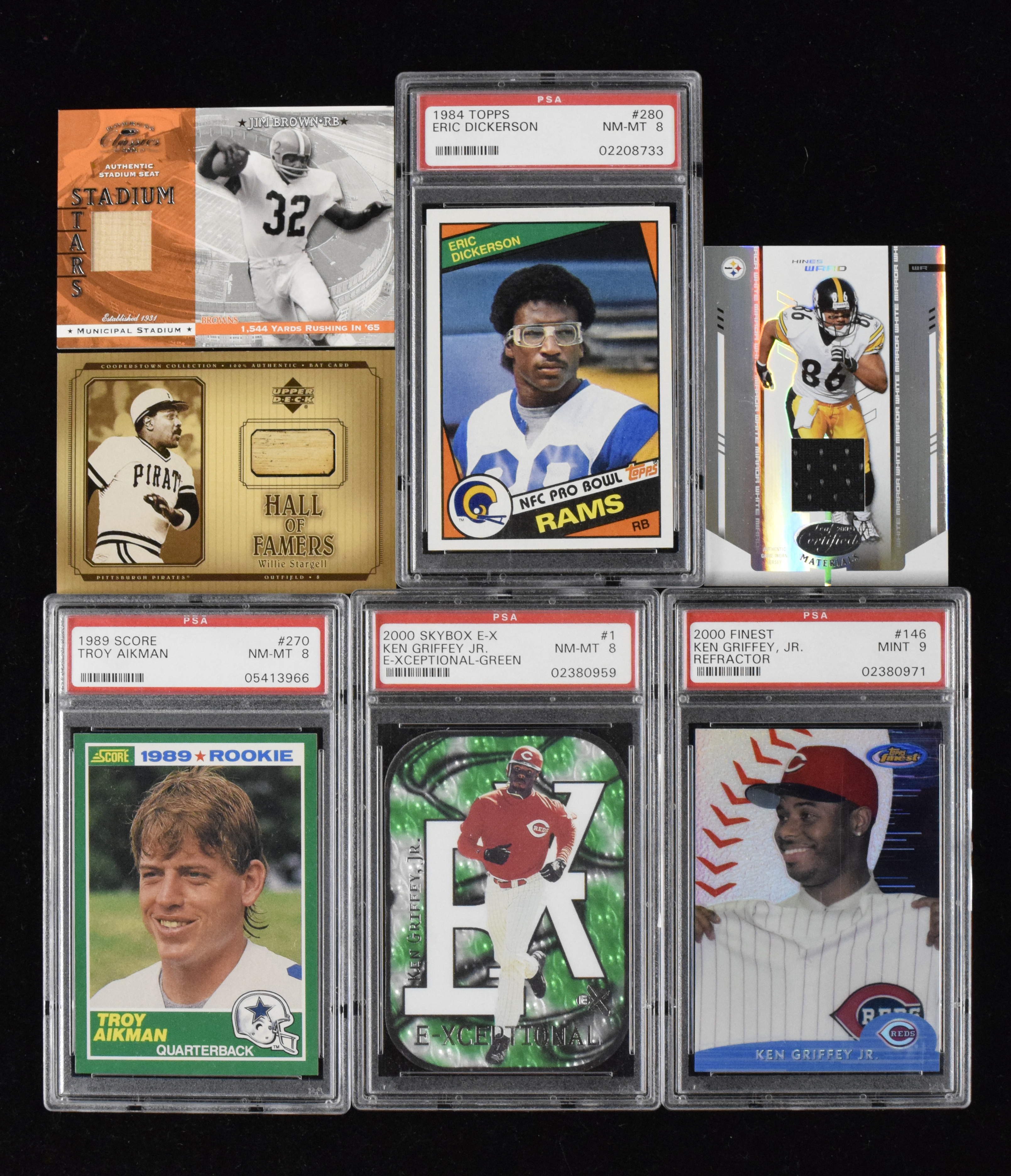 Description:Large lot of modern baseball and football cards including Hall of Famers and stars (EX-NM) Sizeable quantity of cards includes Hall of Famers, stars, parallels, inserts, relic/swatch, some autographed, etc. By volume the majority are "common" players, regional stars, and/or former prospects but there are some better pieces mixed in. Highlights include (7) PSA graded Ken Griffey Jr. cards incl. 2000 Skybox E-Xceptional Green PSA 8 and 2000 Finest Portrait Refractor PSA Mint 9; Troy Aikman Score Rookie (PSA 8); Eric Dickerson Topps Rookie; jersey, bat, or other relic/swatch cards with subjects including Carlos Delgado, Magglio Ordonez, Greg Maddux, Orlando Cepeda, Hines Ward, Fred Taylor, Rabin Yount, Gaylord Perry, Jim Brown, Brooks Robinson, Todd Helton, Frank Robinson, Willie McCovey, Mike Piazza, Tom Glavine, Jim Edmonds, Tony Gonzalez, Chipper Jones, John Smoltz, and Willie Stargell; and a host of HOFer/star base, insert, numbered, parallel, and other cards with notables including Edgerrin James, Emmitt Smith, Walter Payton, Marshall Faulk, Don Mattingly, Ricky Henderson, Mike Piazza, Alex Rodriguez, Mark McGwire, Peyton Manning, Brett Favre, Barry Bonds, and others. All cards are in toploders/holders and the group fills a (4) row storage box. Mostly light scattered wear: EX-NM