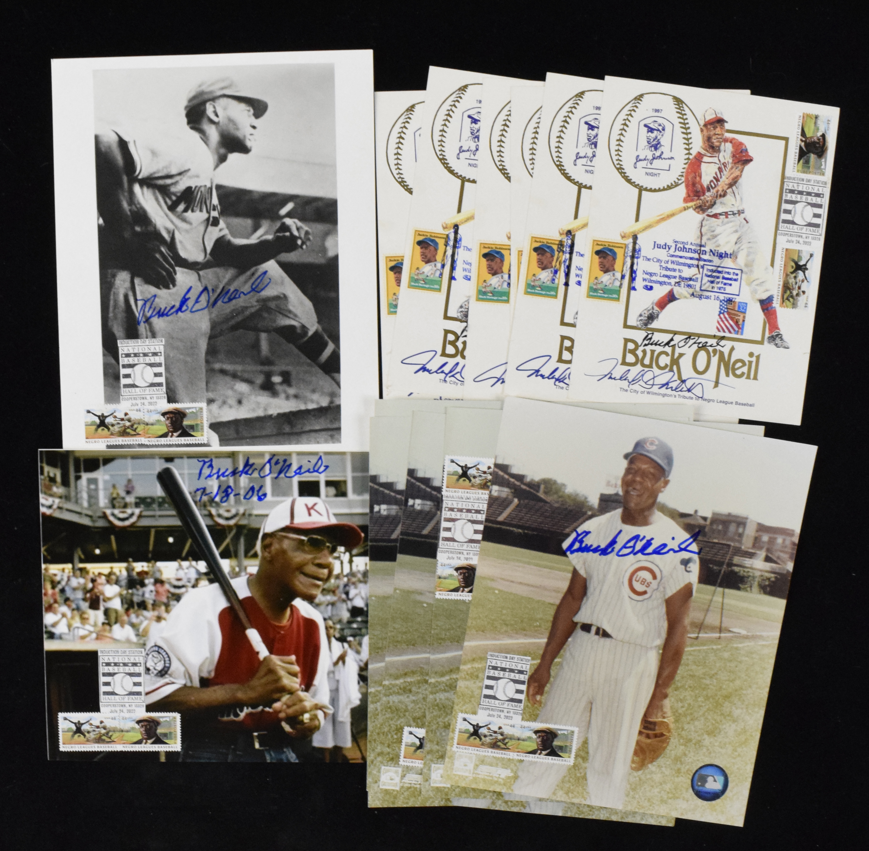 Description:Lot of (18) Buck O'Neil autographed pieces (Sigs. EX/MT-NM) Includes (6) 6"x8" heavy stock artwork cards which are each signed by O'Neil and have a variety of Negro League related stamps/postmarks on the front. There is an additional signature along the bottom of each which may be the artist who did the work depicted; (12) 8"x10" or slightly larger photos or prints, each signed in marker. All have Negro League related stamps affixed. Marker signatures rate 7 to 9/10 out of 10. Also includes a quantity of unsigned prints: Sigs. EX/MT-NM