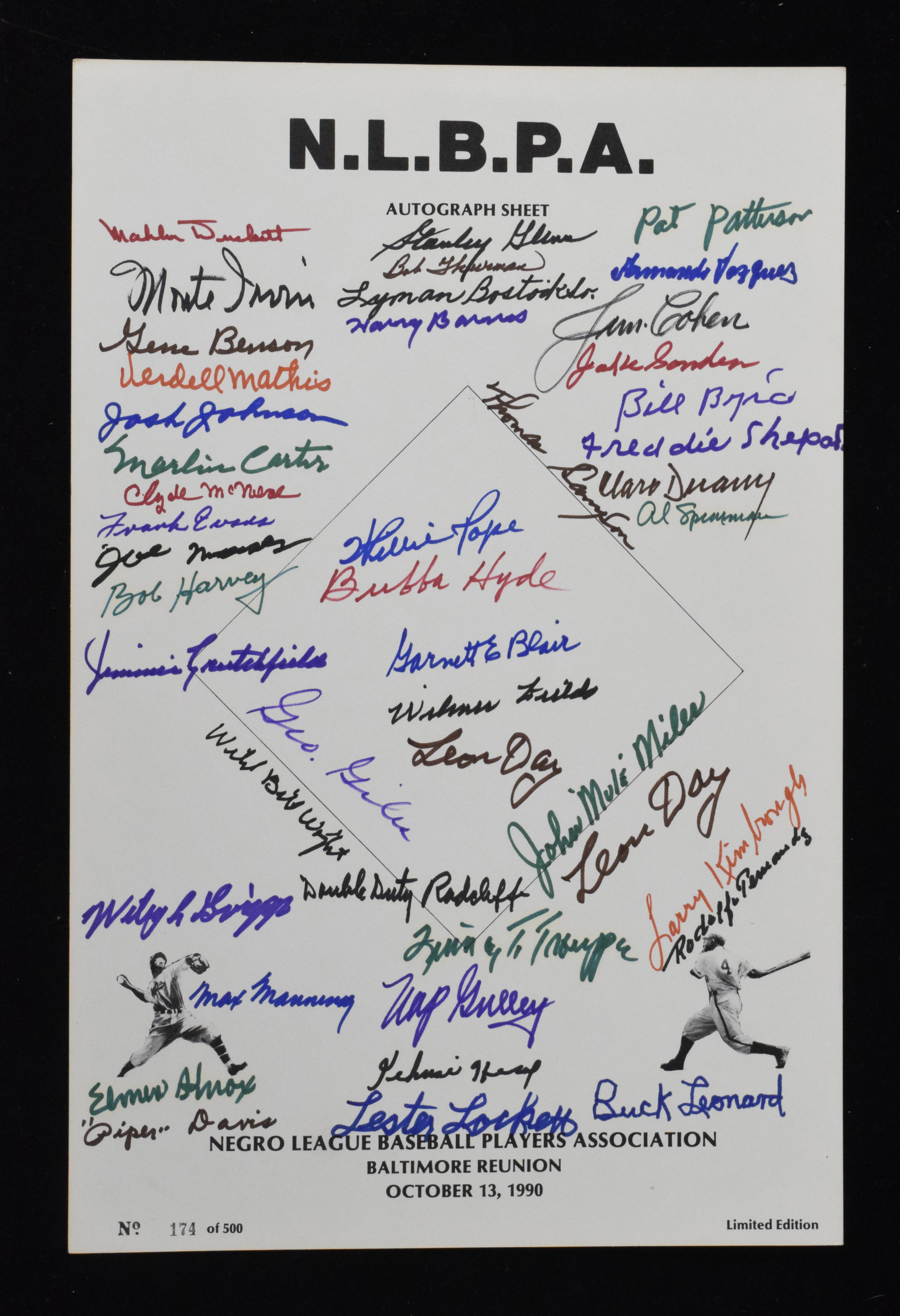 Description:1990 Negro League Reunion autographed sheet (45 sigs) with Monte Irvin provenance (EX-NM) Heavy stock 11"x17" sheet issued for the 1990 N.L.B.P.A. reunion event in Baltimore includes a signed letter of provenance from Hall of Famer Monte Irvin. Total of (45) autographs throughout including Buck Leonard, Monte Irvin, Quincy Trouppe, Gene Benson, Mahlon Duckett, Jimmie Crutchfield, Stan Glenn, Leon Day (twice), Wilmer Fieldds, Double Duty Radcliffe, Max Manning, Nap Gulley, and Lester Lockett. All are done in marker rating 8 out of 10 or better. Hint of light toning/wear: EX-NM