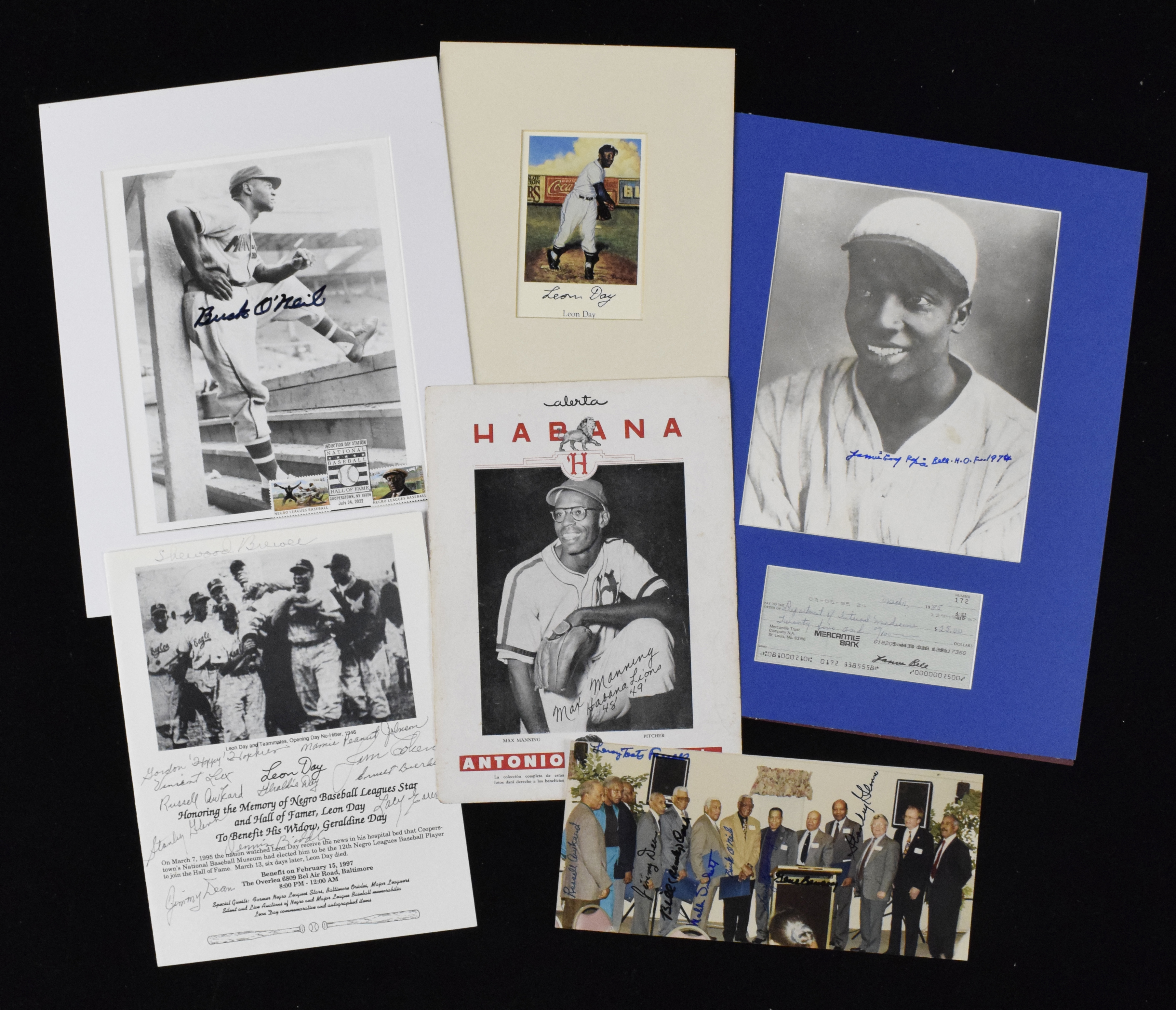 Description:Nice lot of Negro League related autographs including Hall of Famers (VG-NM) Includes 5"x11" photo signed by (9) including Buck O'Neil, Gene Benson, Bill Cash, and Stan Glenn; (2) programs from a Leon Day rembrance ceremony (along with a few unsigned programs from what appear to have been his funeral) which are each signed on the cover by atendees. Notables include Sherwood Brewer, Mrs. Leon Day, Mamie Johnson, Russell Awkward, and Stanley Glenn; Cool Papa Bell signed 8"x10" (HOF inscription) and check in 12"x16" matted display; matted signed 8"x10" photos of Buck O'Neil (3), Monte Irvin, Josh Gibson Jr, and Bert Simmons; matted signed postcards of Leon Day and Bill Wright; Max Manning signed "Alerta" vintage cuban magazine premium; Ray Dandridge signed trading card; (6) Ted Radcliffe signed 11"x17" prints (some wear); signed 8"x10" photos including Leon Day and Buck O'Neil; misc pieces (cutss, notes, etc) with signers including Piper Davis, Frank Barnes, Art Pennington, Max Manning, Josh Gibson Jr, and Double Duty Radcliffe. Three or four pieces are personalized and please note to a small portion have Negro League related stamps affixed (some postmarked). Light to moderate scattered wear. Also includes a handful of unsigned pieces: VG-NM